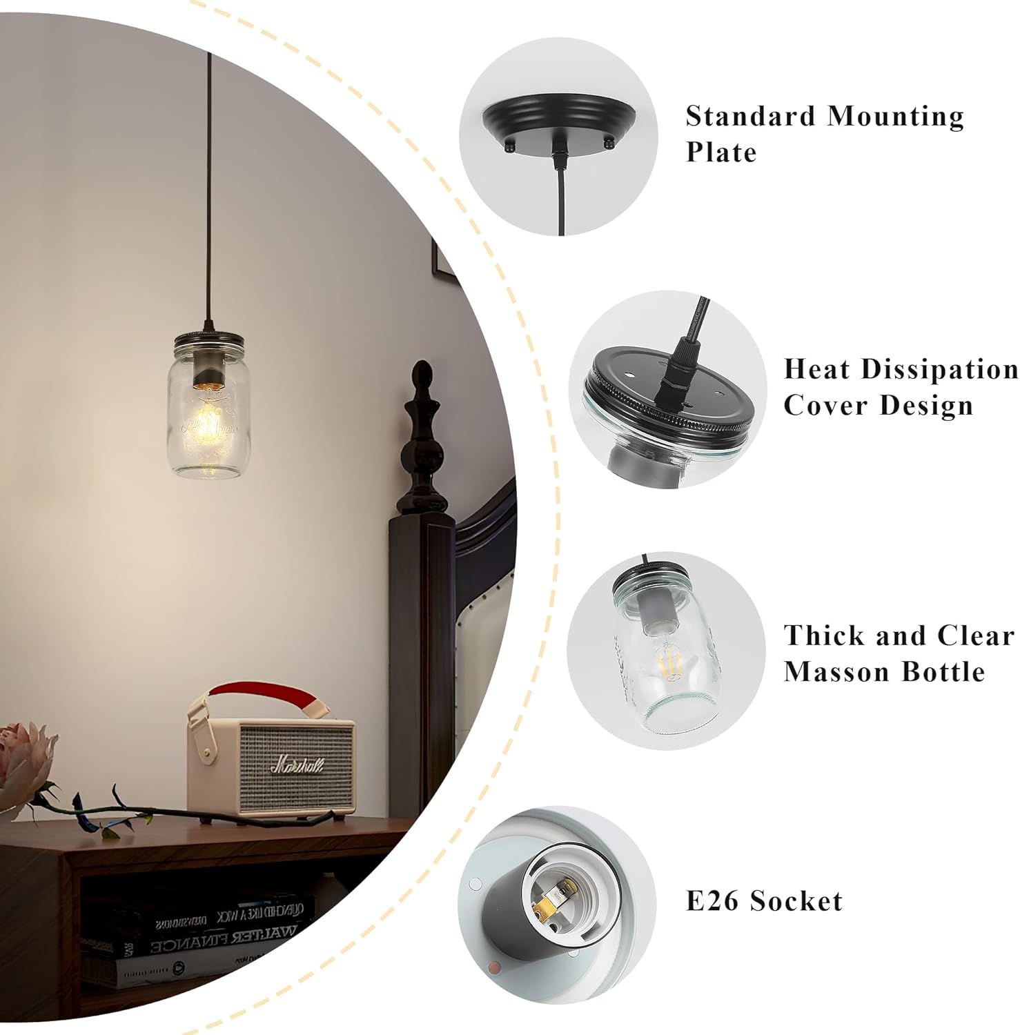 • Classic Mason Jar Pendant Light: The 1-light farmhouse pendant light with black finish and clear glass shade emits ample glow to light up the whole space. This mini black pendant light is perfect for a variety of decor styles ranging from vintage industrial to modern farmhouse, especially for kitchen islands, bedrooms, living rooms, dining rooms, sinks, hallways, etc.