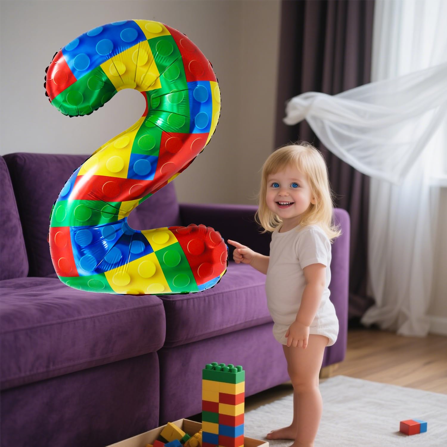 32 Inch Stackable Block Number Balloon – Colorful Brick Building Themed Big Helium Digits for Kids Birthday Party Decorations (Building Block, Number 2)