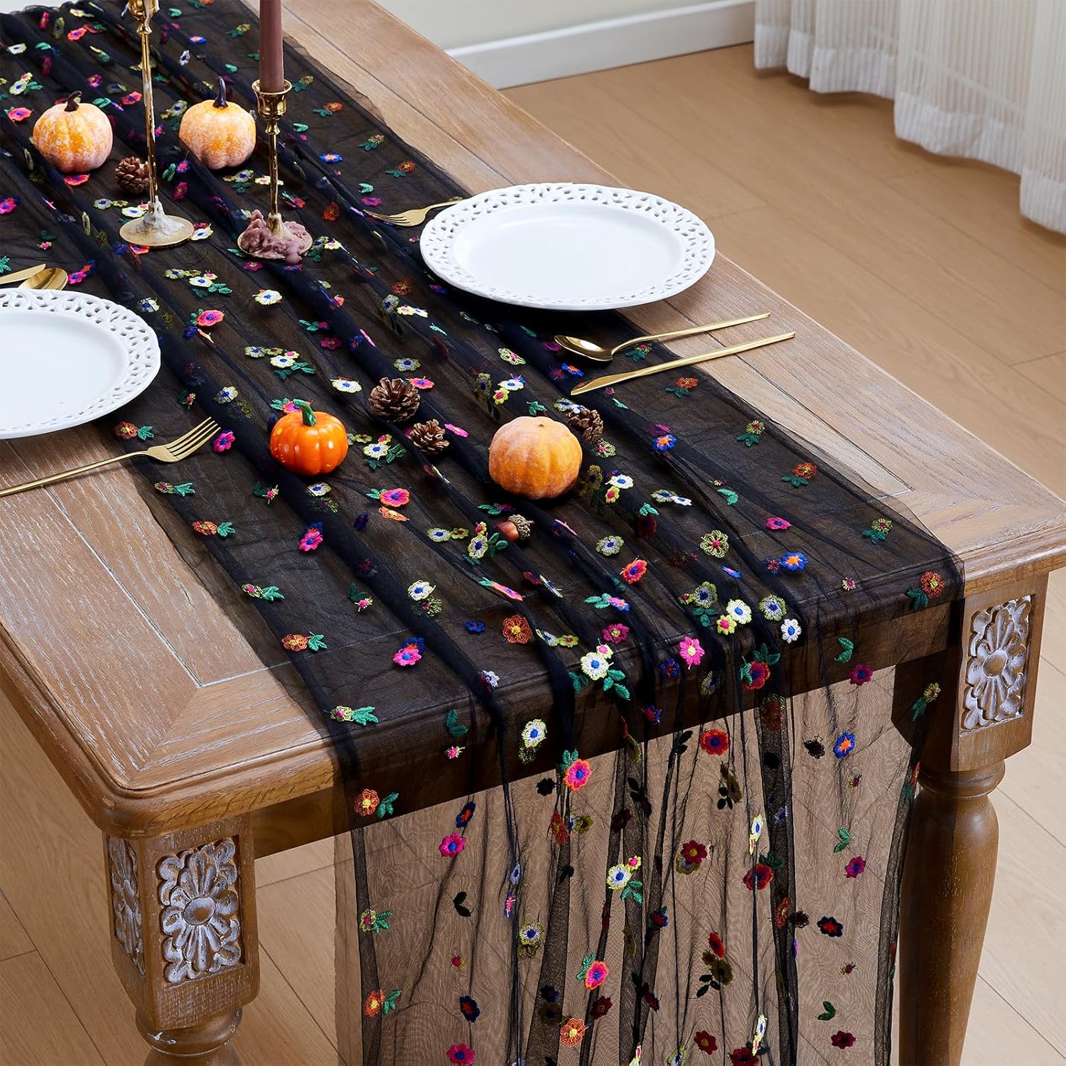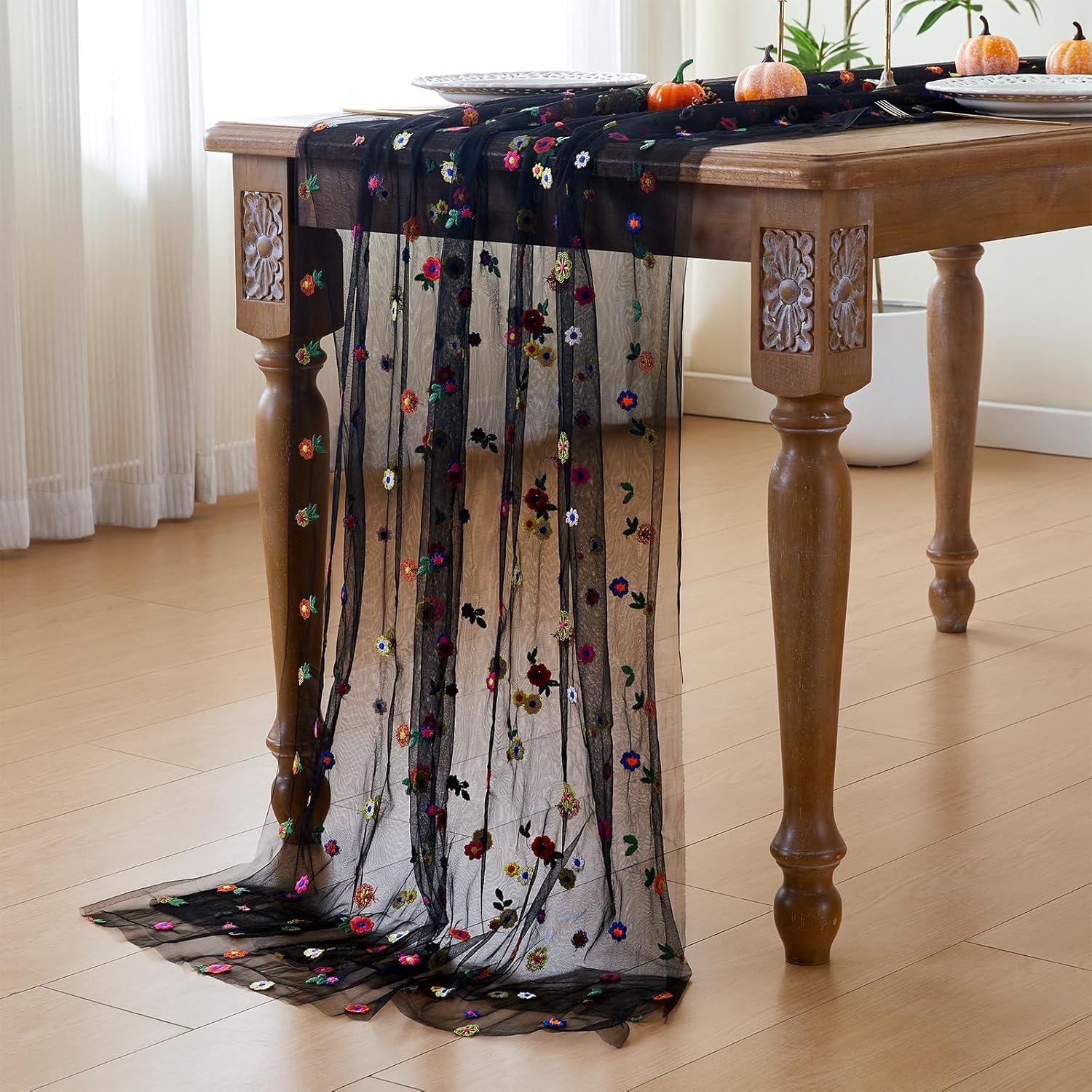 JIALE Black Floral Table Runner, Embroidery Daisy Seasonal Table Decorations, 120Inch 10FT Tulle Fabric for Home Decor, Bridal Shower Wedding, Baby Shower Parties, DIY Craft