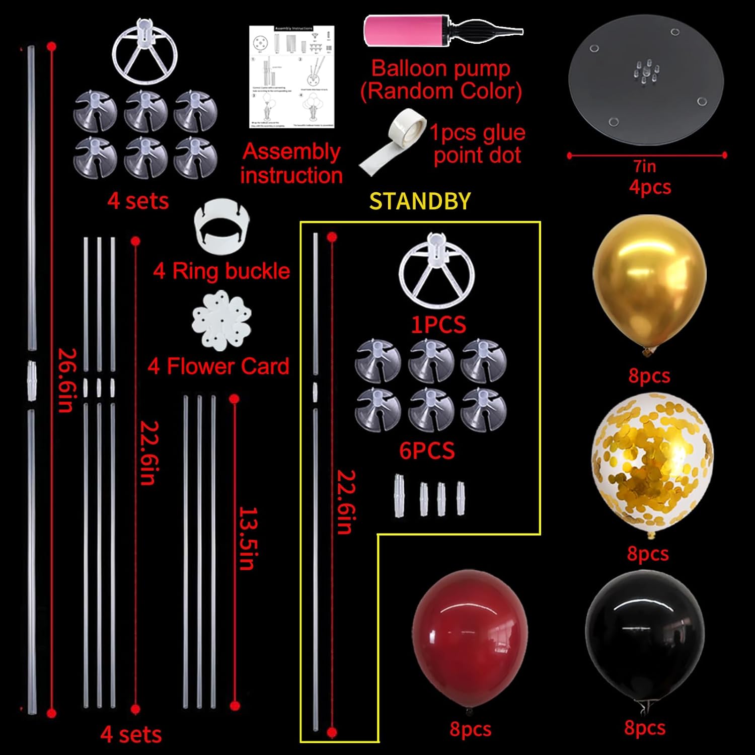 • Included Components : Balloon Stand, Filling Pump, Glue, Red Black Gold Balloons, Tying Tool