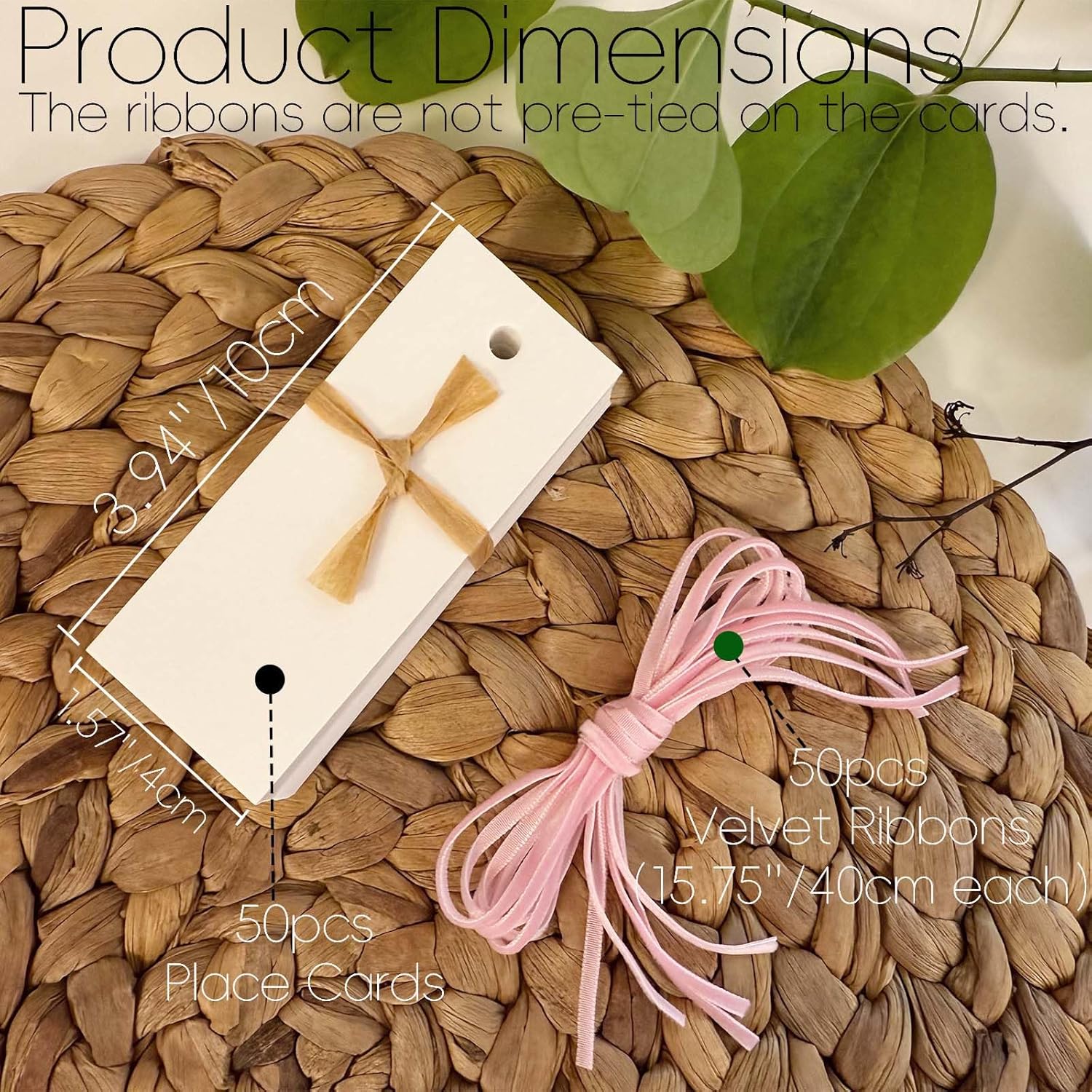• What's Included :50pcs place cards (3.94'' x 1.57'') and 50pcs velvet ribbon (15.75" each). The ribbons are not pre-tied on the cards
