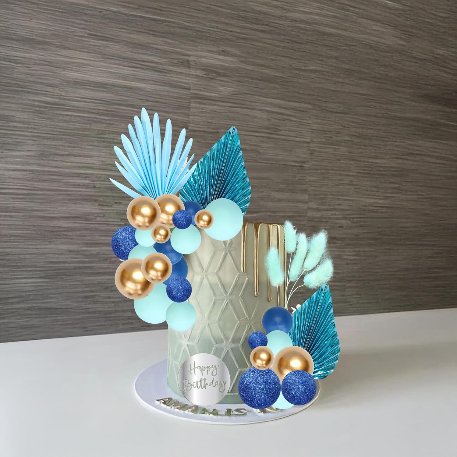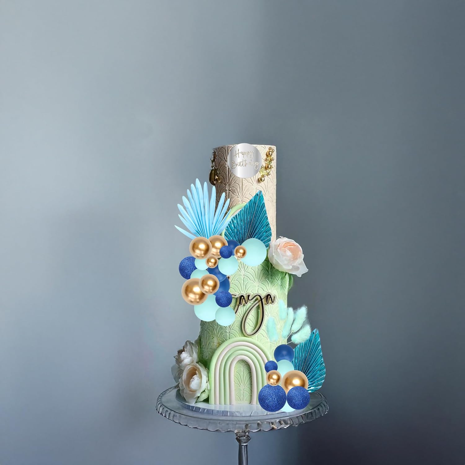 Ephlyn 33 Pack Balls Cake Toppers Boho Palm Leaves Cake Decorations Round Acrylic Happy Birthday Cupcake Toppers for Birthday Wedding Baby Shower Party Supplies Blue