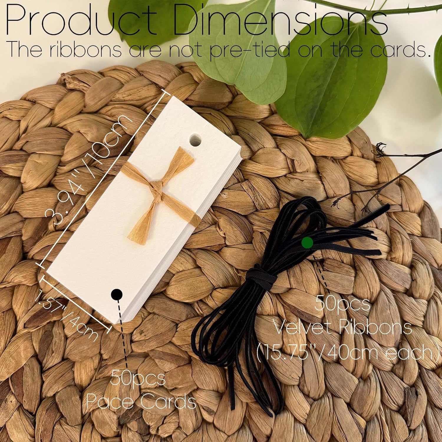 • What's Included :50pcs place cards (3.94'' x 1.57'') and 50pcs velvet ribbon (15.75" each). The ribbons are not pre-tied on the cards