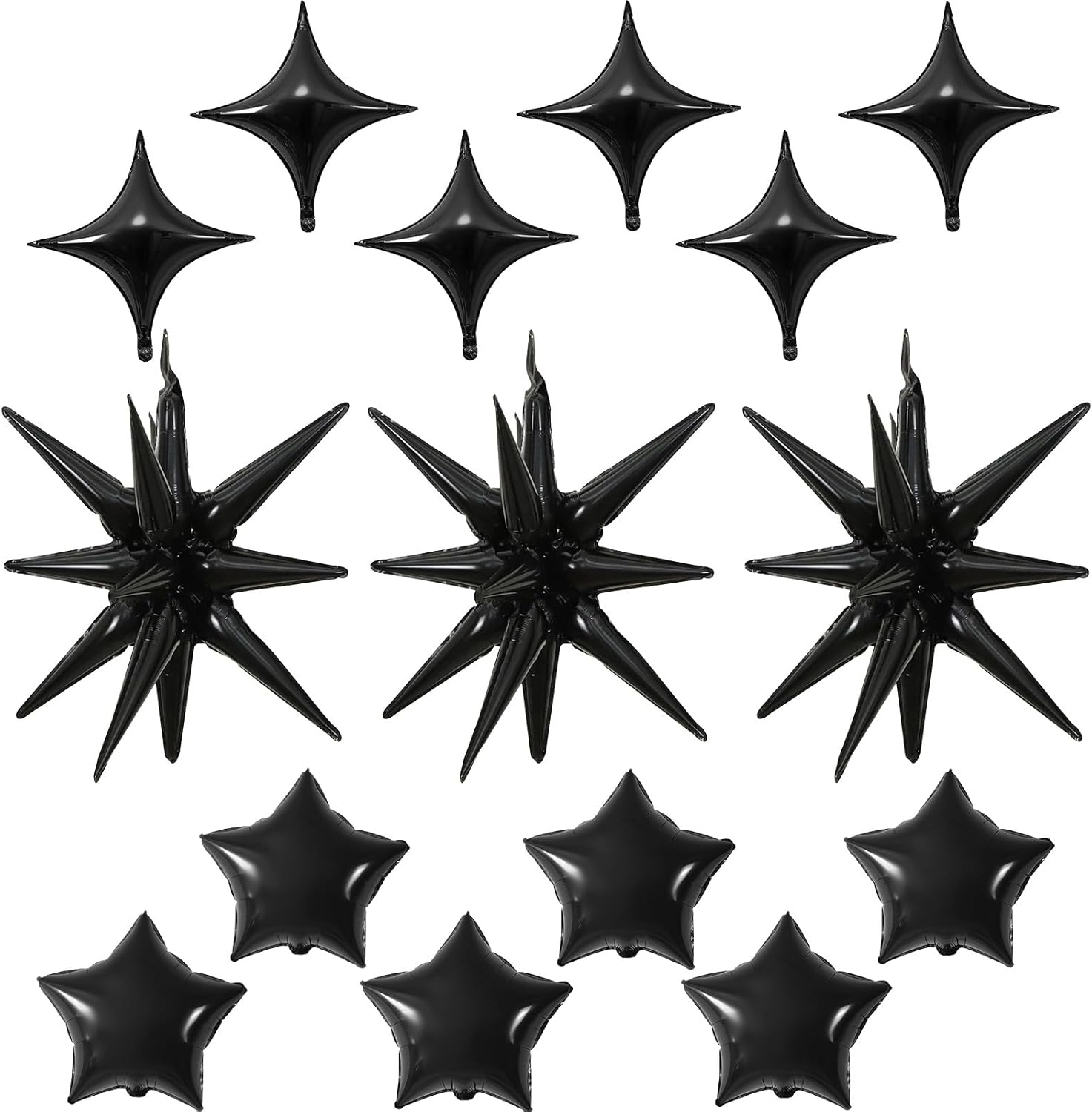 • Black Star Balloons Set: Package includes: Black aluminum foil star balloons (explosion stars × 3, four-pointed stars × 6, five-pointed stars × 6) , a straw and ribbon
