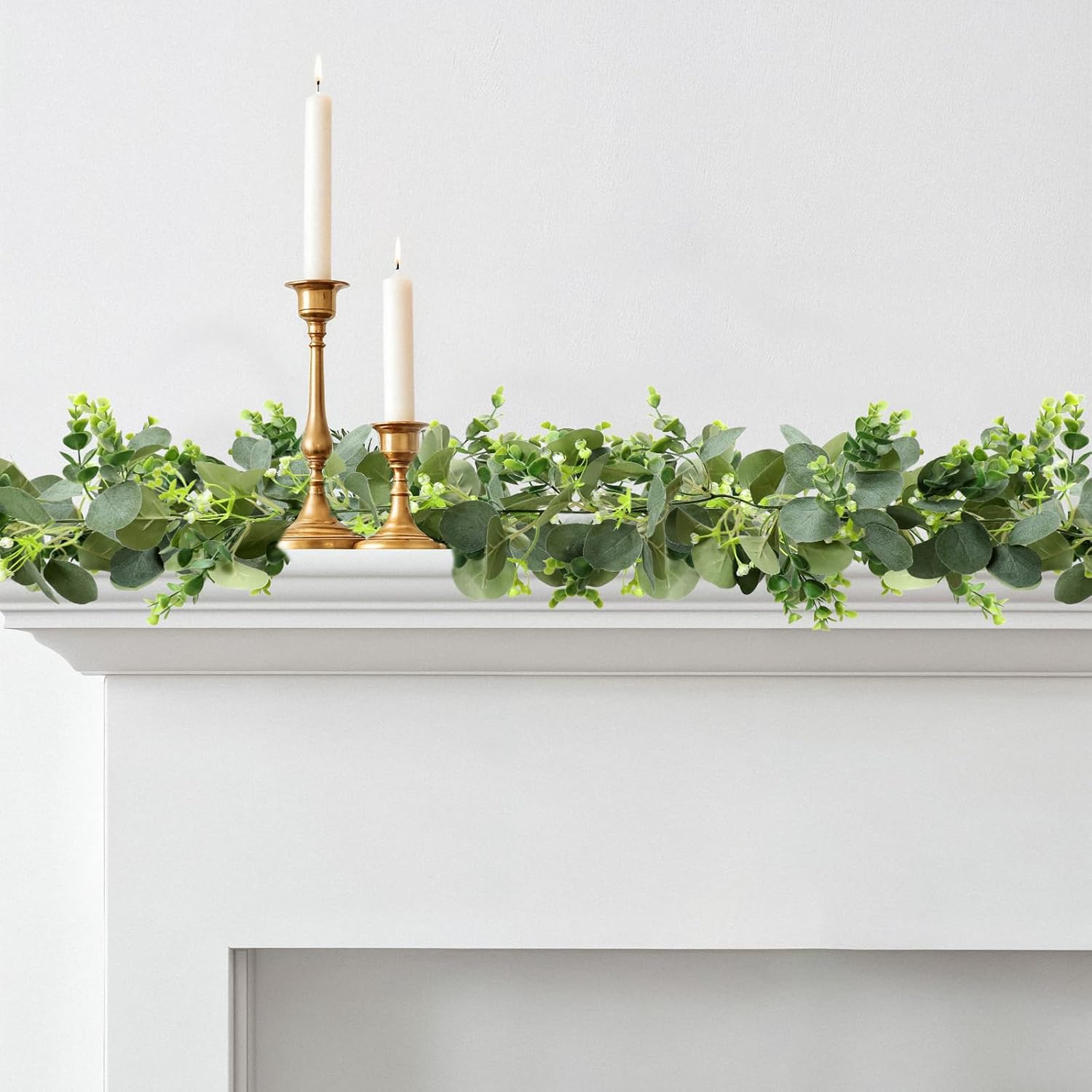 • 🌿🌿Realistic Appearance: The leaves of the garland wreath are uniform in color and realistic in shape. The shape of the greenery garland can be adjusted according to personal preference to make it look more real and vivid. Made of high-quality silk leaves and durable plastic stems, our eucalyptus decor not only look lush and lifelike, but are also designed to last, make your space eye-catching.
