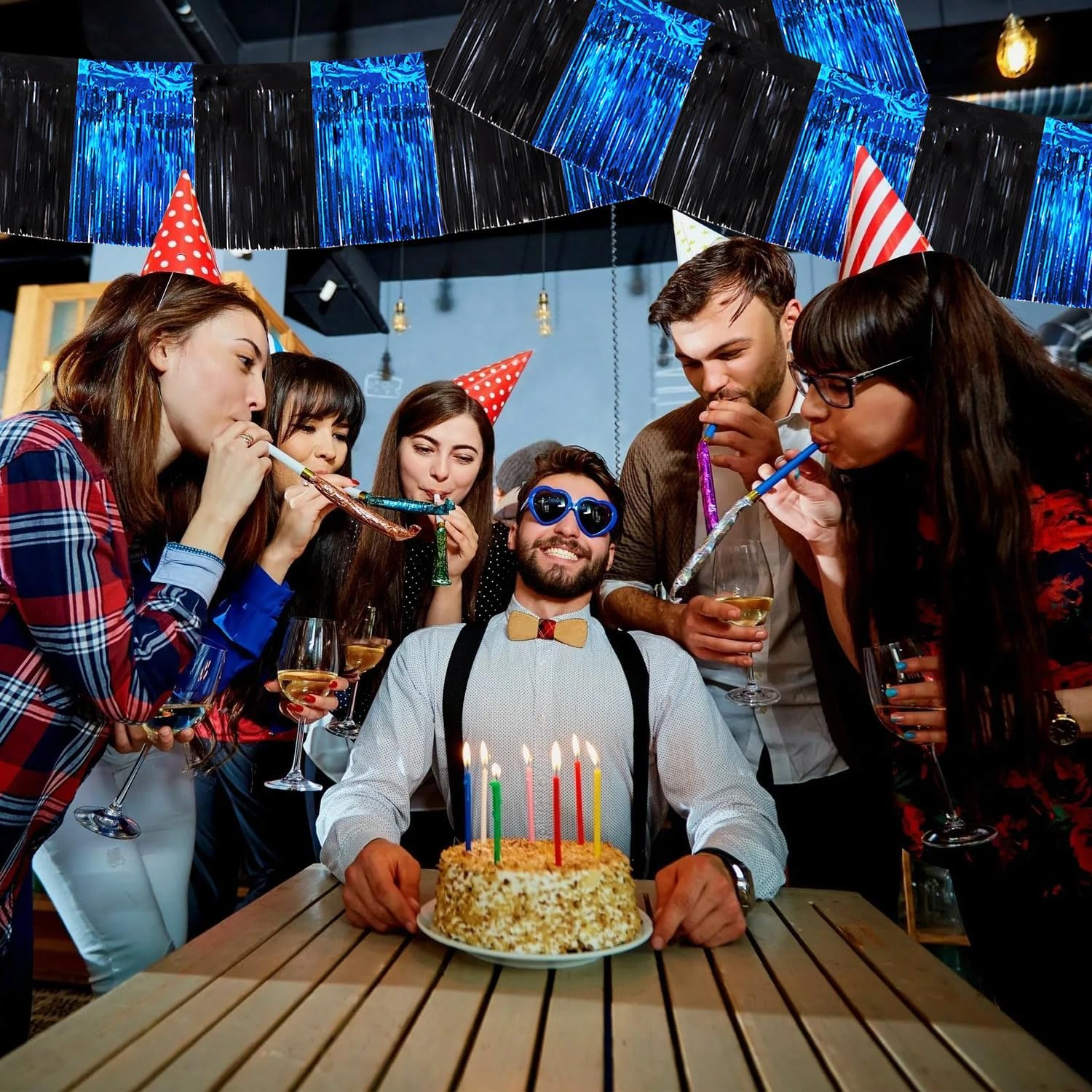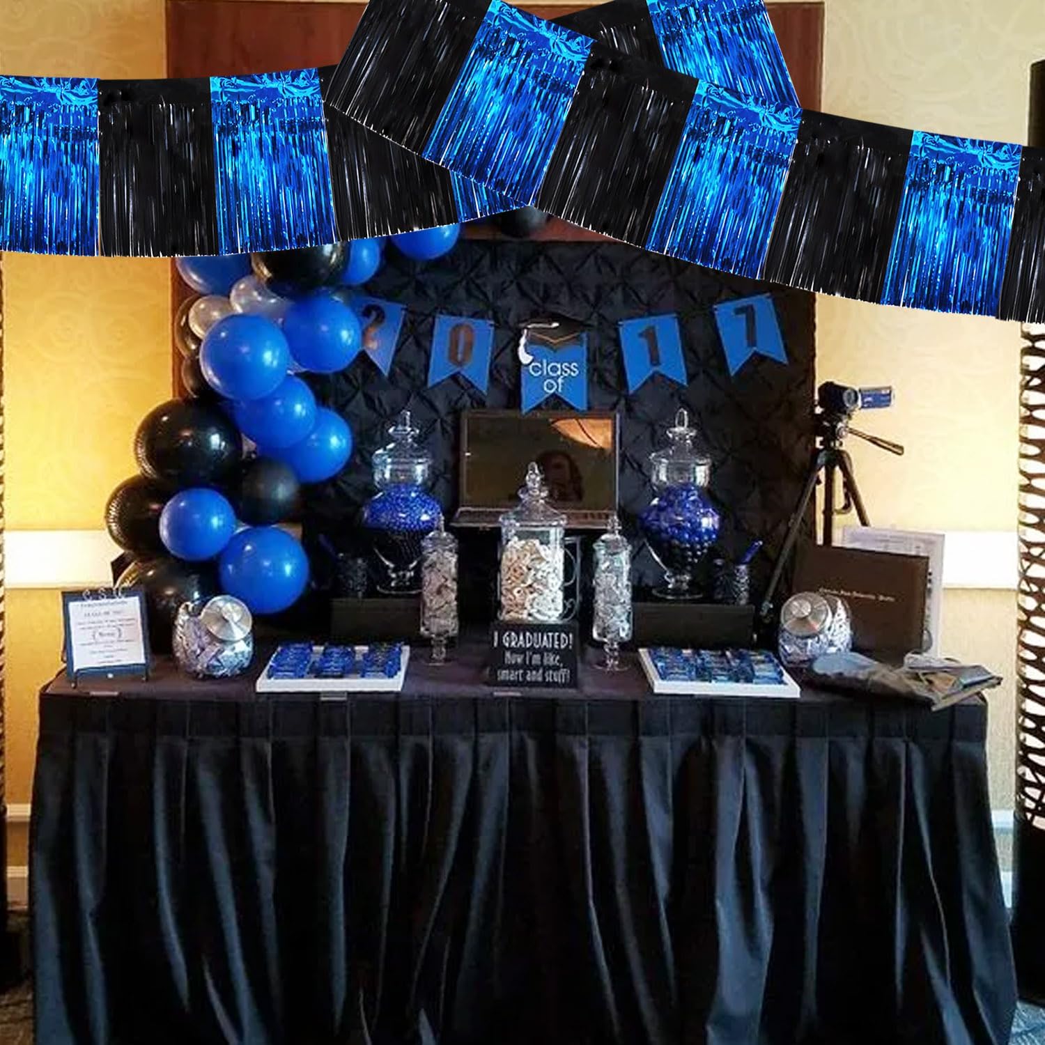 BEISHIDA 3 Packs Metallic Foil Fringe Garland Black Blue Wall Hanging Tinsel Fringe Banners for Car Floats Bridal Shower Wedding Birthday Easter Graduation Holiday Party Decoration(30 Feet)