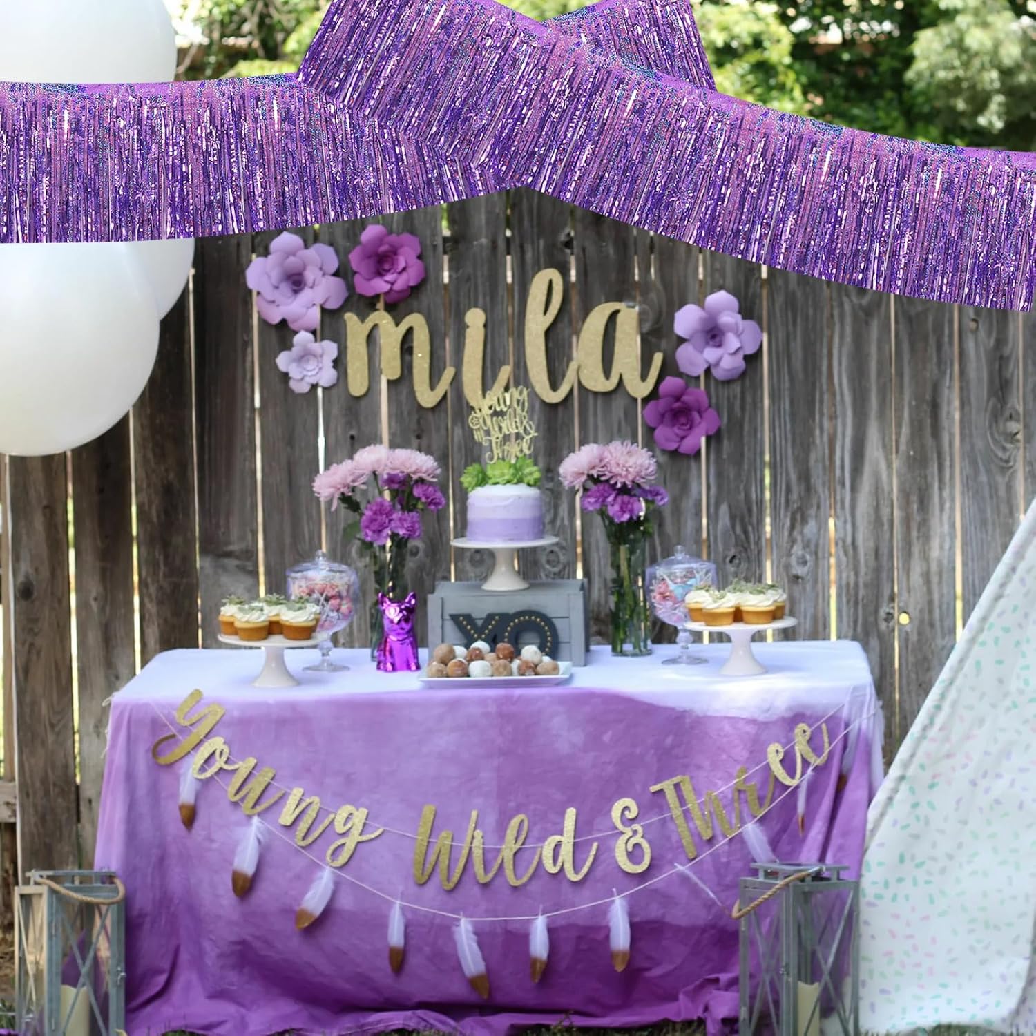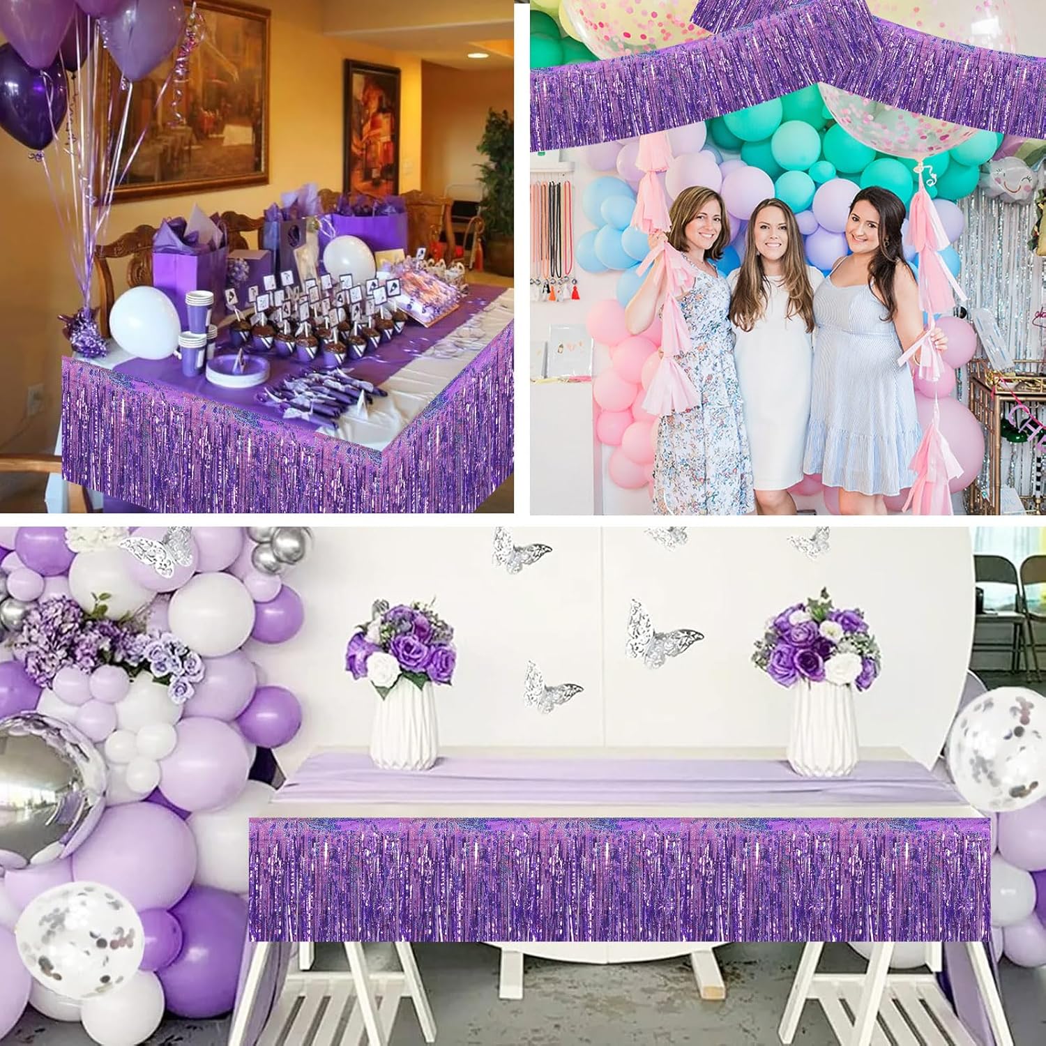 BEISHIDA 3 Packs Metallic Foil Fringe Garland Laser Light Purple Wall Hanging Tinsel Fringe Banners for Car Floats Bridal Shower Wedding Birthday Easter Graduation Holiday Party Decoration(30 Feet)