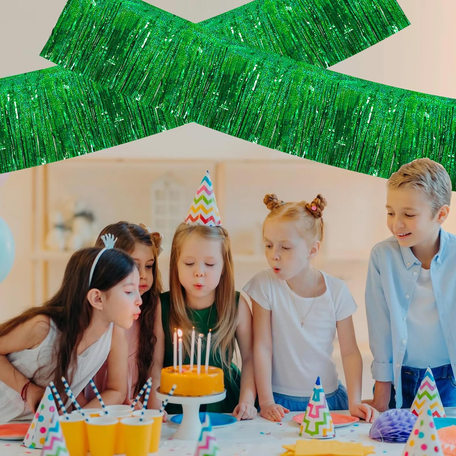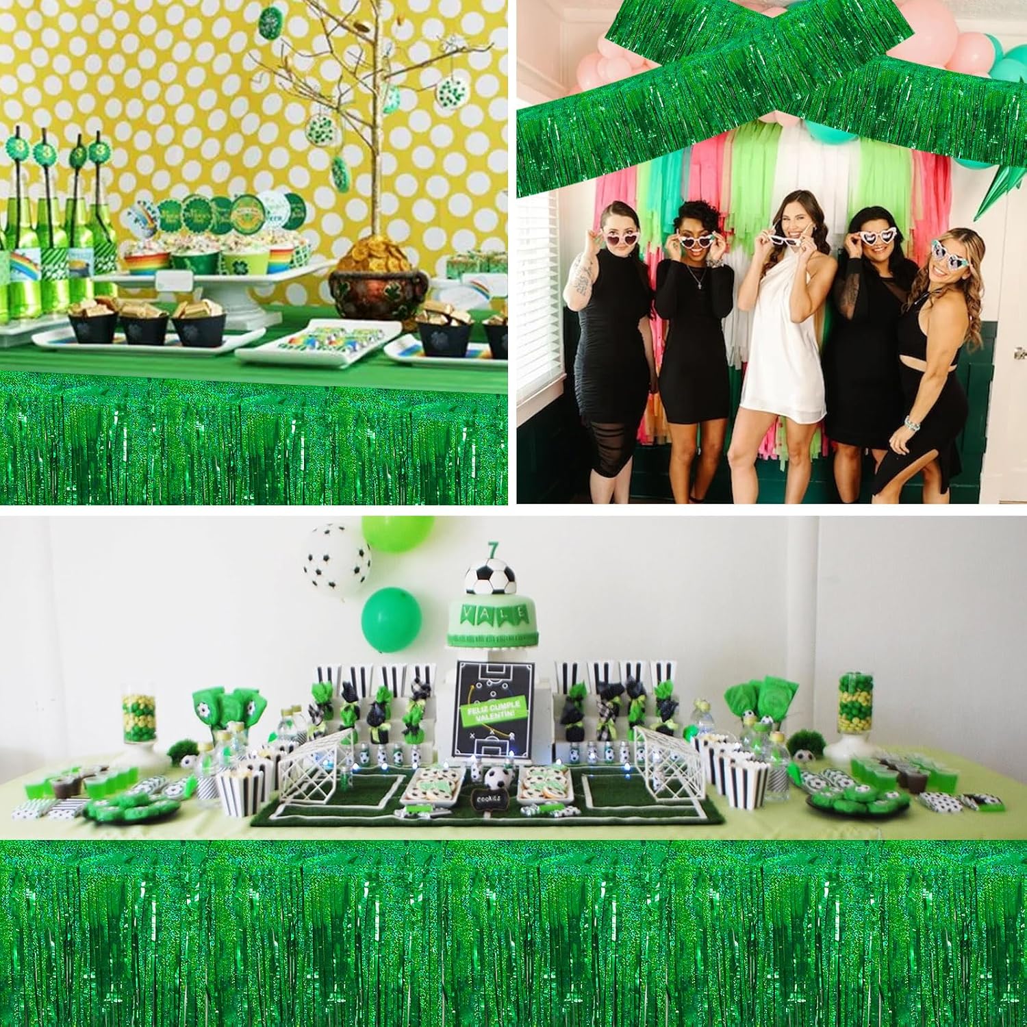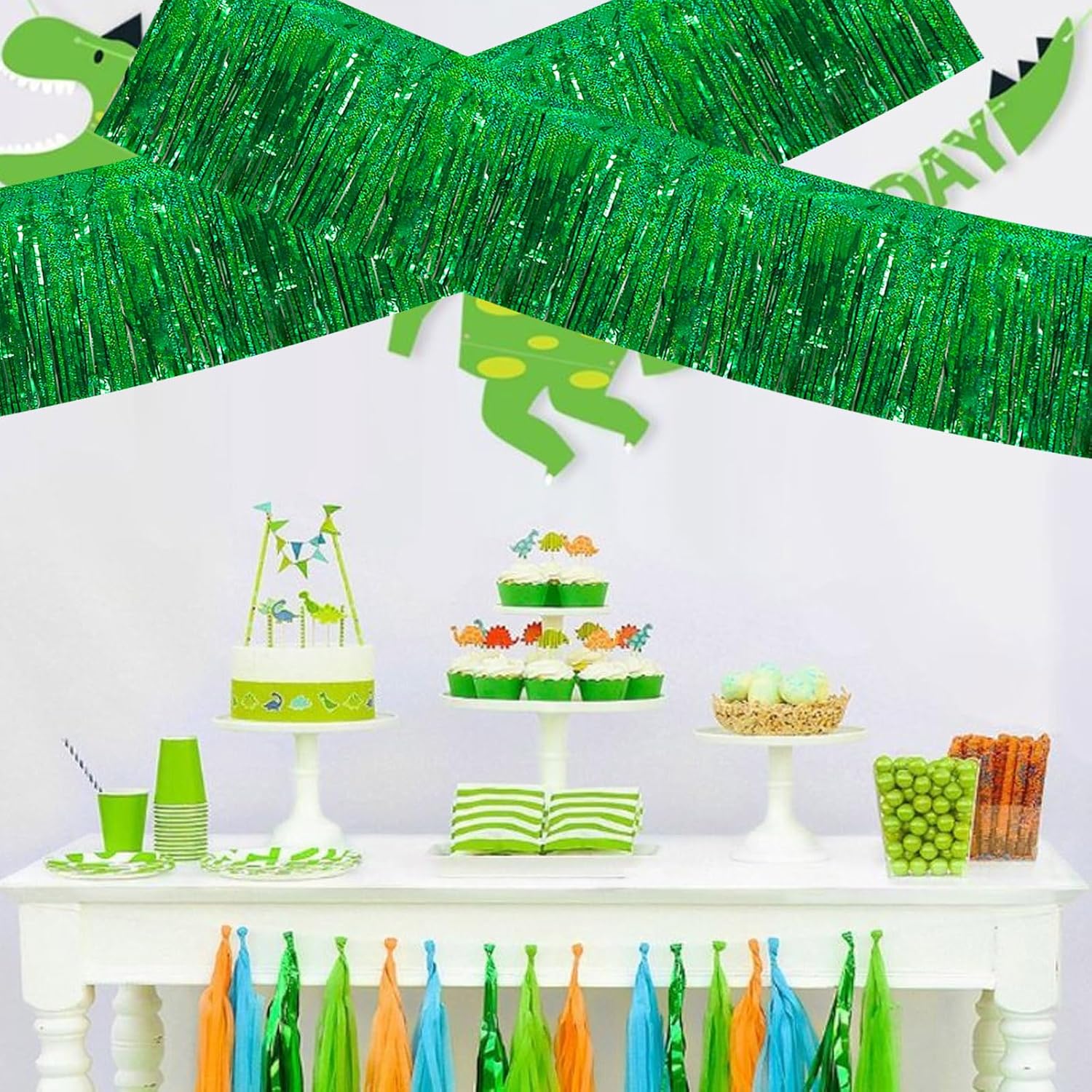 BEISHIDA 3 Packs Metallic Foil Fringe Garland Laser Green Wall Hanging Tinsel Fringe Banners for Car Floats Bridal Shower Wedding Birthday Easter Graduation Holiday Party Decoration(30 Feet)