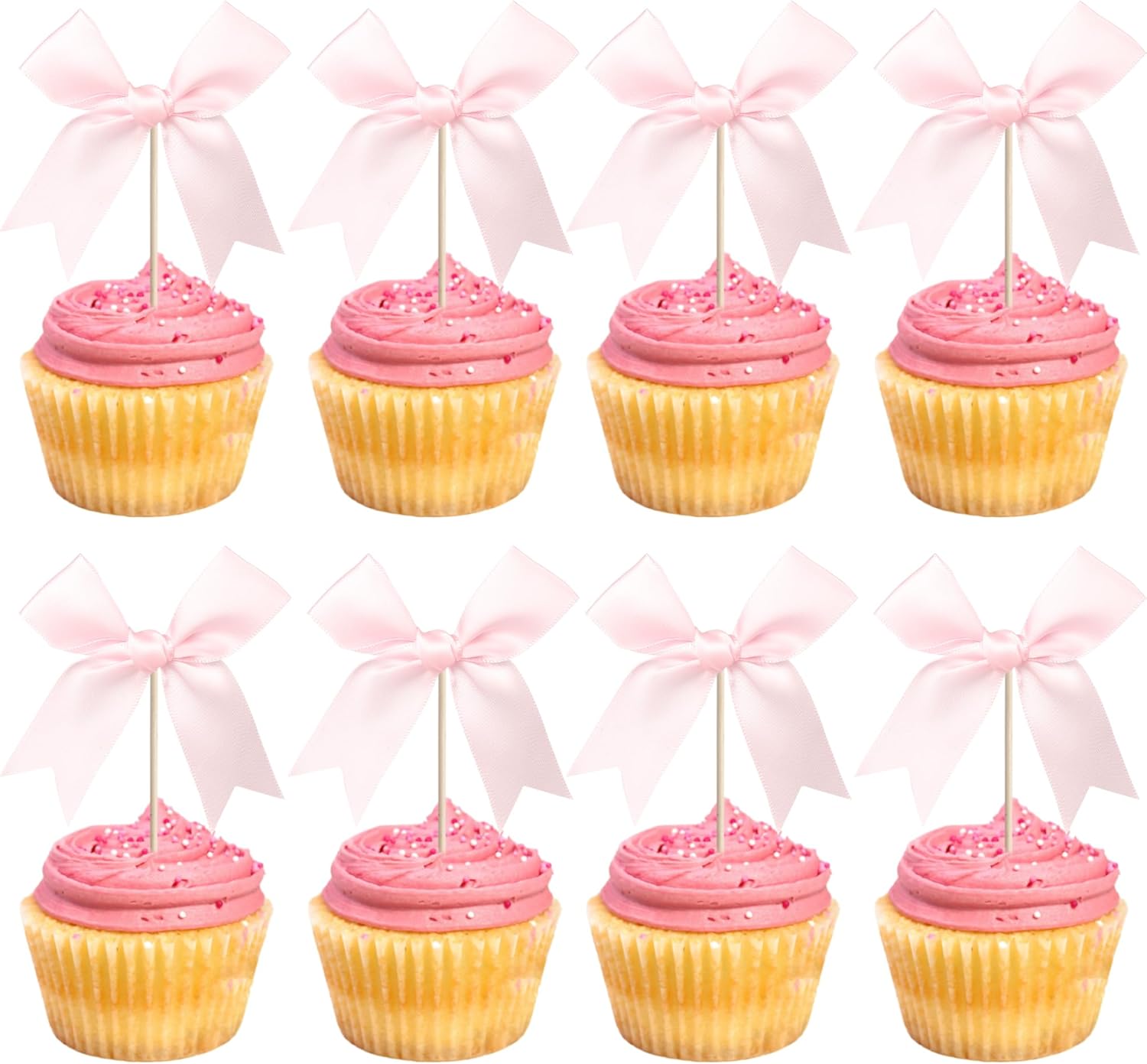 24 PCS Bow Cupcake Toppers Bowknot Coquette Bow Girls Birthday Cake Decorations Bow Cake Toppers Bowknot Cupcake Picks for Baby Shower Birthday Wedding Bridal Engagement Party Supplies Pink
