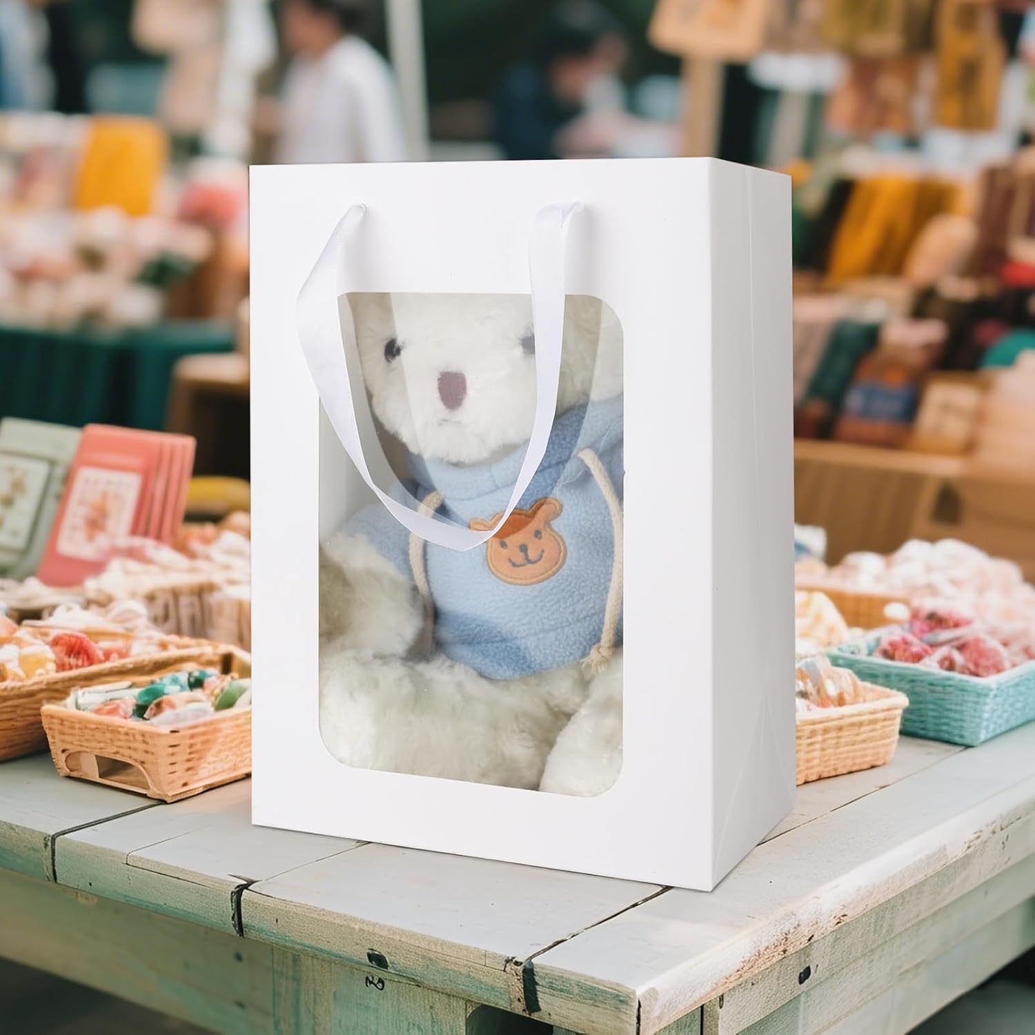 MOXARYSU 3 Pcs White Gift Bags with Clear Window: 9.8x5.1x7.1 Inch Medium Kraft Paper Bags with Handle For Party Business Birthday Wedding (White,3p)