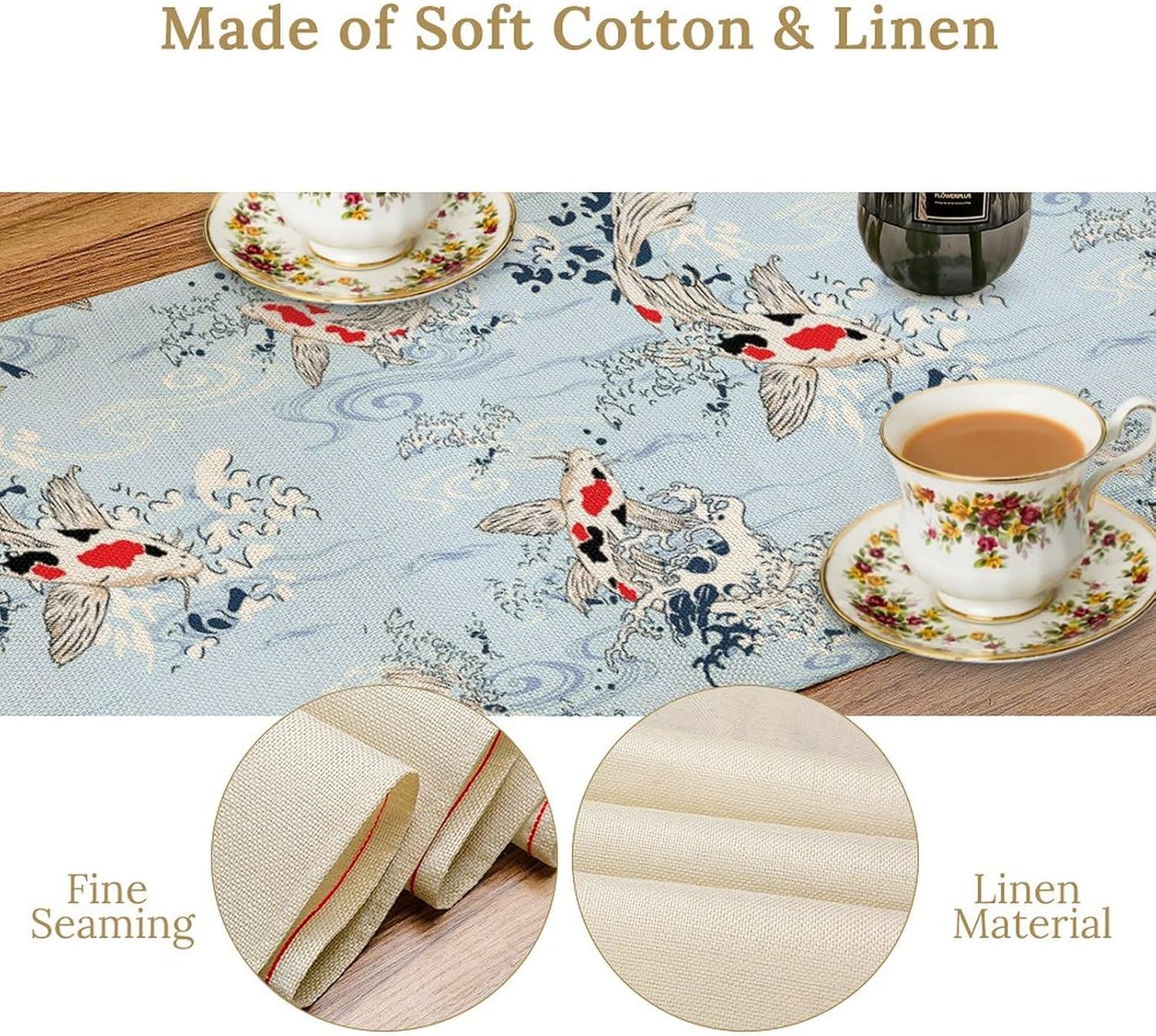 Kio Fish Table Runner Waves Retro Japanese Tradition Art Printed Burlap Runner Home Kitchen Dining Table Living Room Decor Fabric 1 Panel W13xL120in