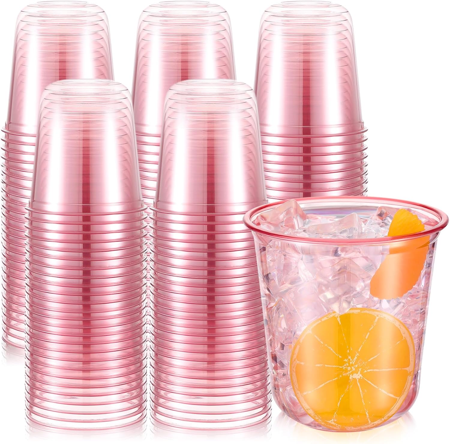 200 Pcs Disposable Stemless Glasses 12oz Crystal Plastic Wine Glasses Clear Classic Pet Cup for Meeting Weddings Birthdays Cocktail Christmas Party Supplies (Pink)