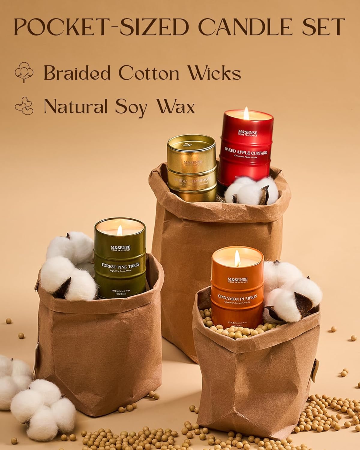• 💚 Sustainable Material - M&SENSE candles are all crafted with the finest and most natural ingredients. Using high-end vegetable wax and unbleached cotton wicks in a reusable and recyclable tin. Packaged in recycled honeycomb paper and cardboard box for a more sustainable future.