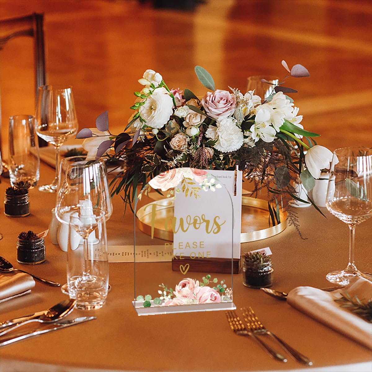 Acrylic Wedding Signs, Bridal Shower Decorations, Modern Calligraphy Arch Acrylic Table Top Sign for Wedding Reception and Engagement Parties - Favors Please Take One (Clear Pink Flowers)