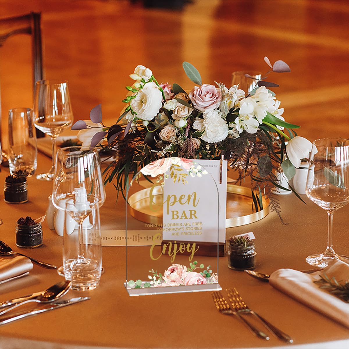 Acrylic Wedding Signs, Bridal Shower Decorations, Open Bar Signs for Reception, Modern Calligraphy Arch Acrylic Table Top Sign for Wedding Reception and Engagement Parties (Clear Pink Flowers)