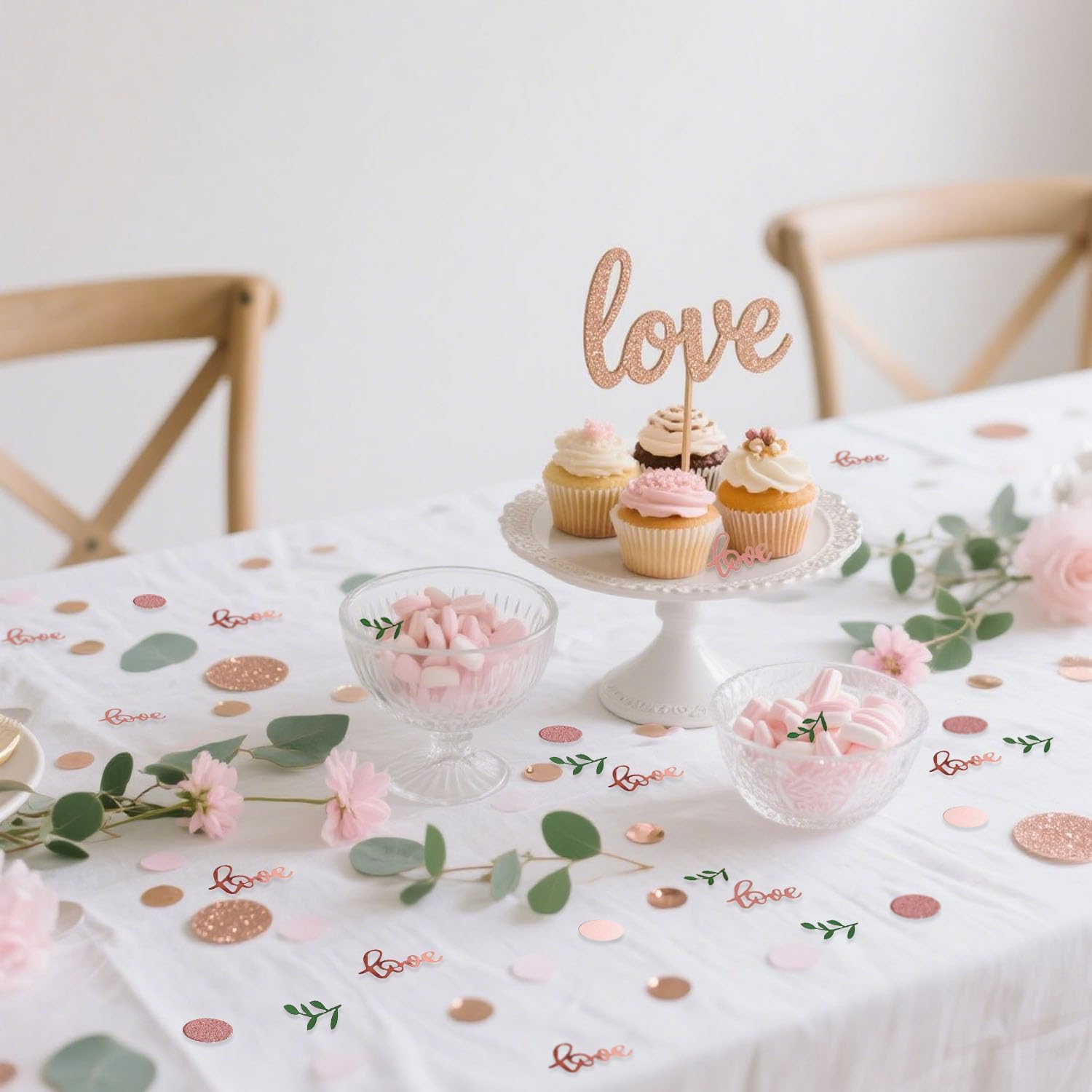 • PACKAGE INCLUDES-- rose gold love table scatter, greenery Eucalyptus Confetti, rose gold conffeti dots, pink confetti dots, White confetti dots