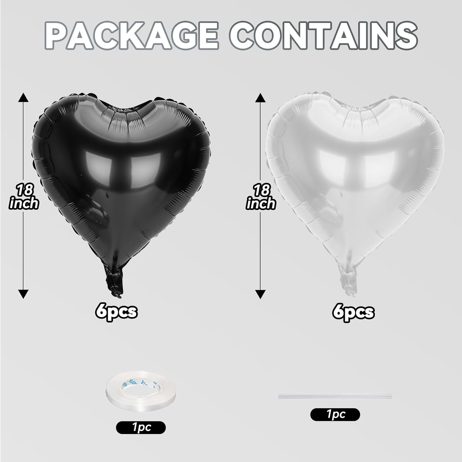 • Black Silver Heart Balloons:This 18 inches heart shaped balloons includes 6* black heart balloons, 6* silver heart balloons, 1* ribbon, 1*straw, adding romance and warmth to your celebration. These large heart balloons will be the highlight of your party decorations, creating an atmosphere of love for everyone.