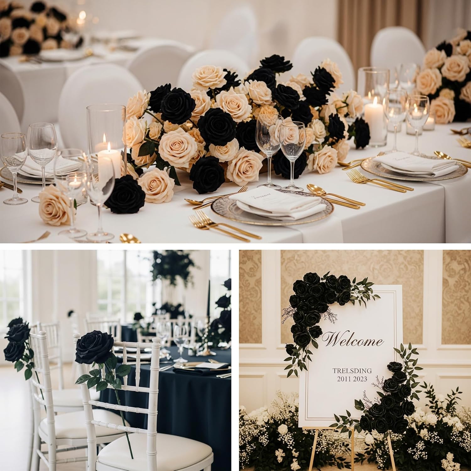 • Ultra-Realistic Velvet & Silk Design: Crafted with lifelike details, these black silk roses mimic delicate petals and natural sheen, offering a real look perfect for wedding cake decorations, anniversary gifts, or bridal shower elegance. Their black glitter roses effect elevates centerpieces and floral swag, while the velvet-silk blend ensures enduring beauty for funeral arrangements or outdoor wedding arbor decor without fading