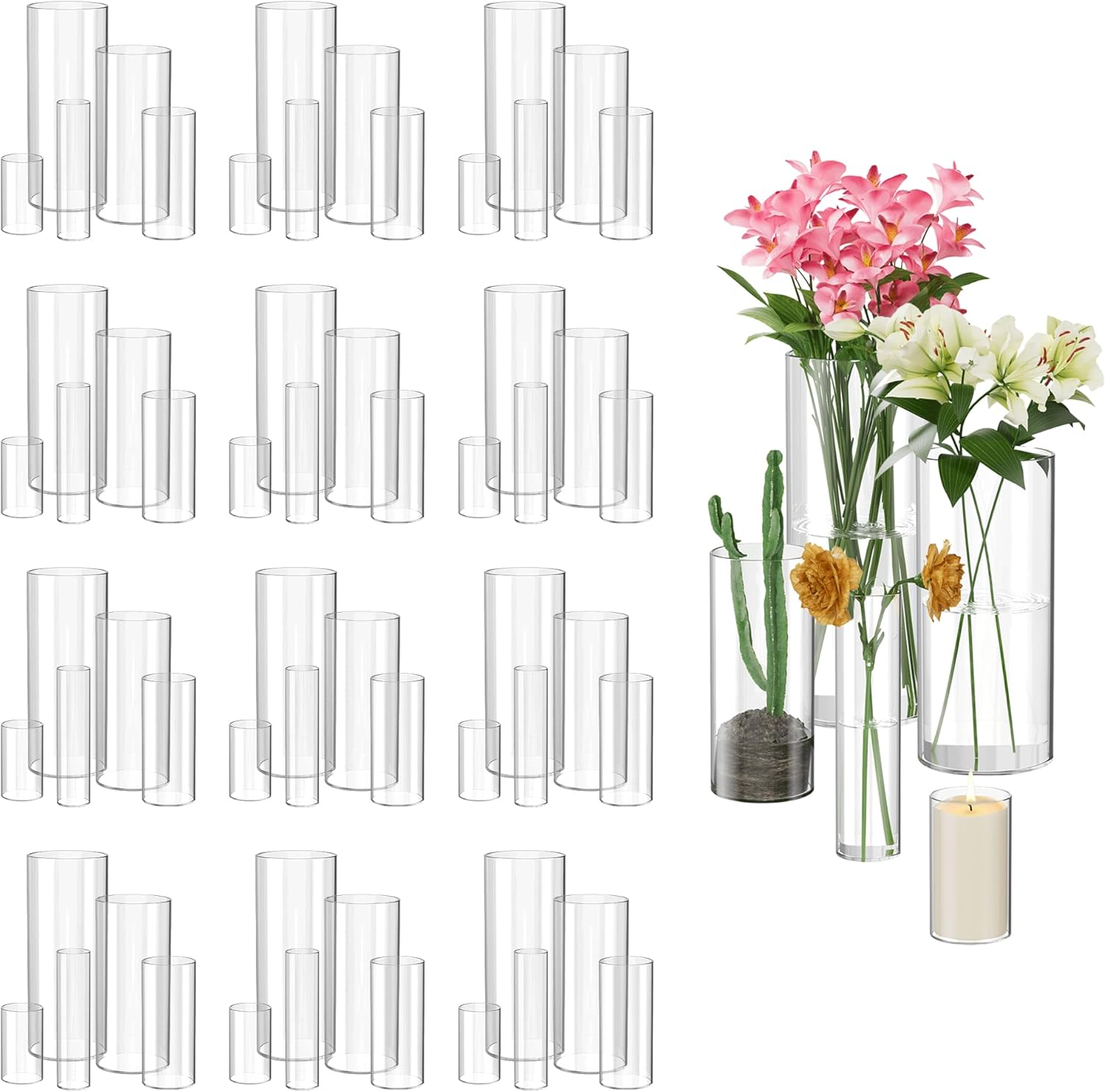 • 5-Size Cylinder Vase Set for Versatility​ From minimalist single stems (2.1×3.9 inchs) to lavish bouquets (3.7×9.8 inchs), 60 premium ​Cylinder vases​ in 5 sizes fit orchids, roses, or succulents.