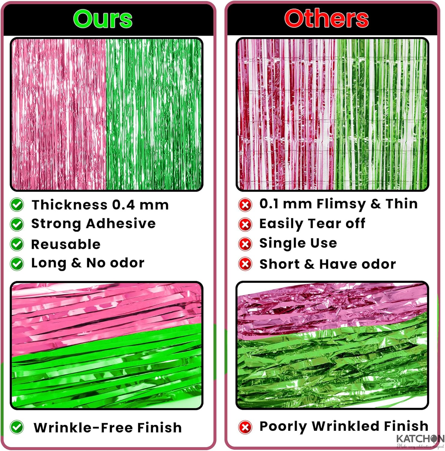 • 3.2X6.5 FT LARGE SIZE PACK OF 2 PINK AND GREEN FOIL FRINGE CURTAINS –: This pack includes pack of 2 pink and green foil fringe curtains made of shiny metallic foil. Each measures 3.2 ft wide by 6.5 ft tall, creating a vibrant pink and green backdrop for pink and green party decorations, green and pink birthday decorations, baby shower backdrop ideas, and princess birthday party decorations. Use as a pink tinsel backdrop, pink fringe, tassel backdrop, or party streamers backdrop.