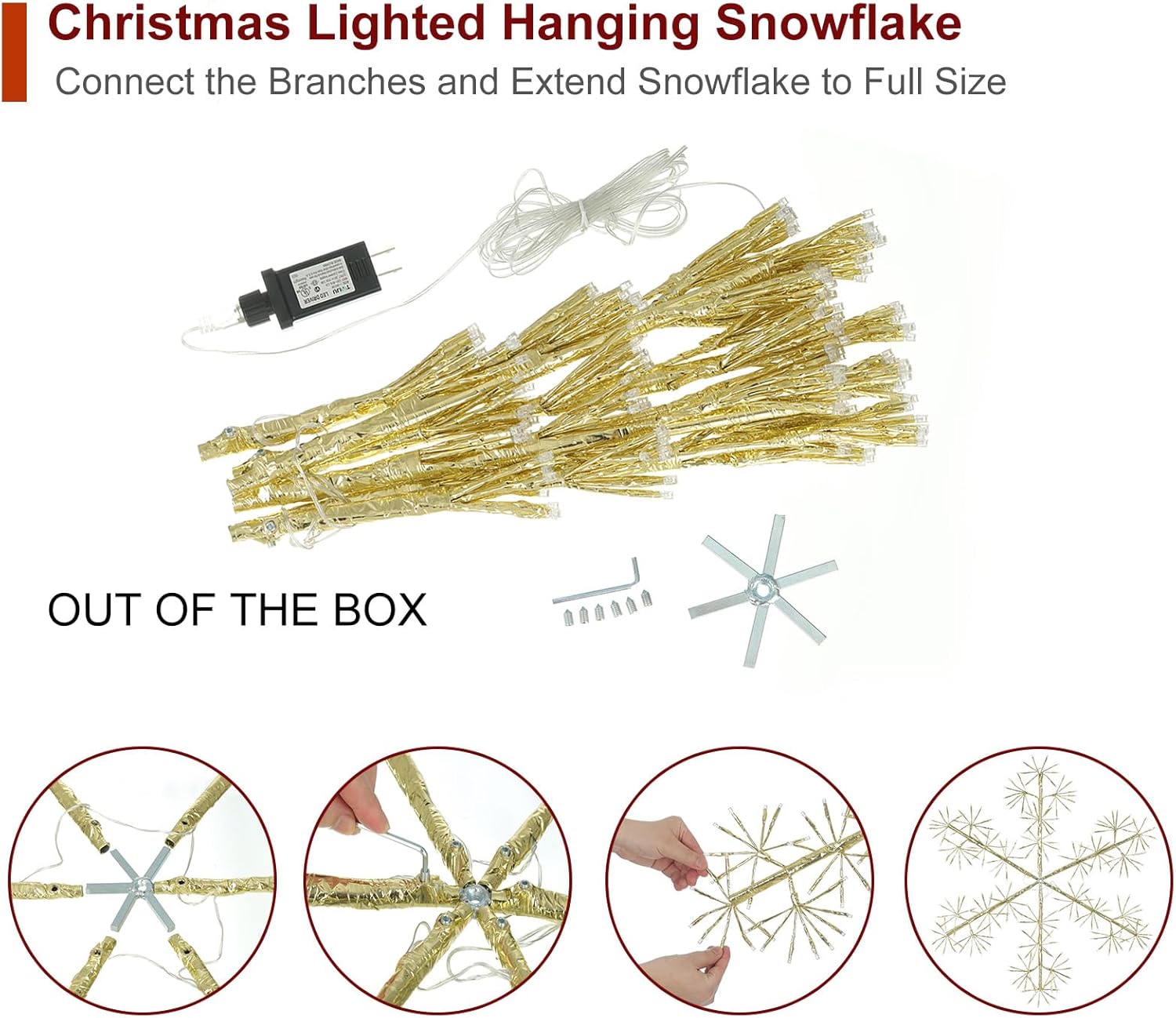 • Shape-able: It is flexible and shape-able, can be fanned out into a snowflake shape. Built-in handy hanging circular ring is easy for hanging in different scenes. UL-approved transformer for easy use throughout your home. Collapsible for easy storage