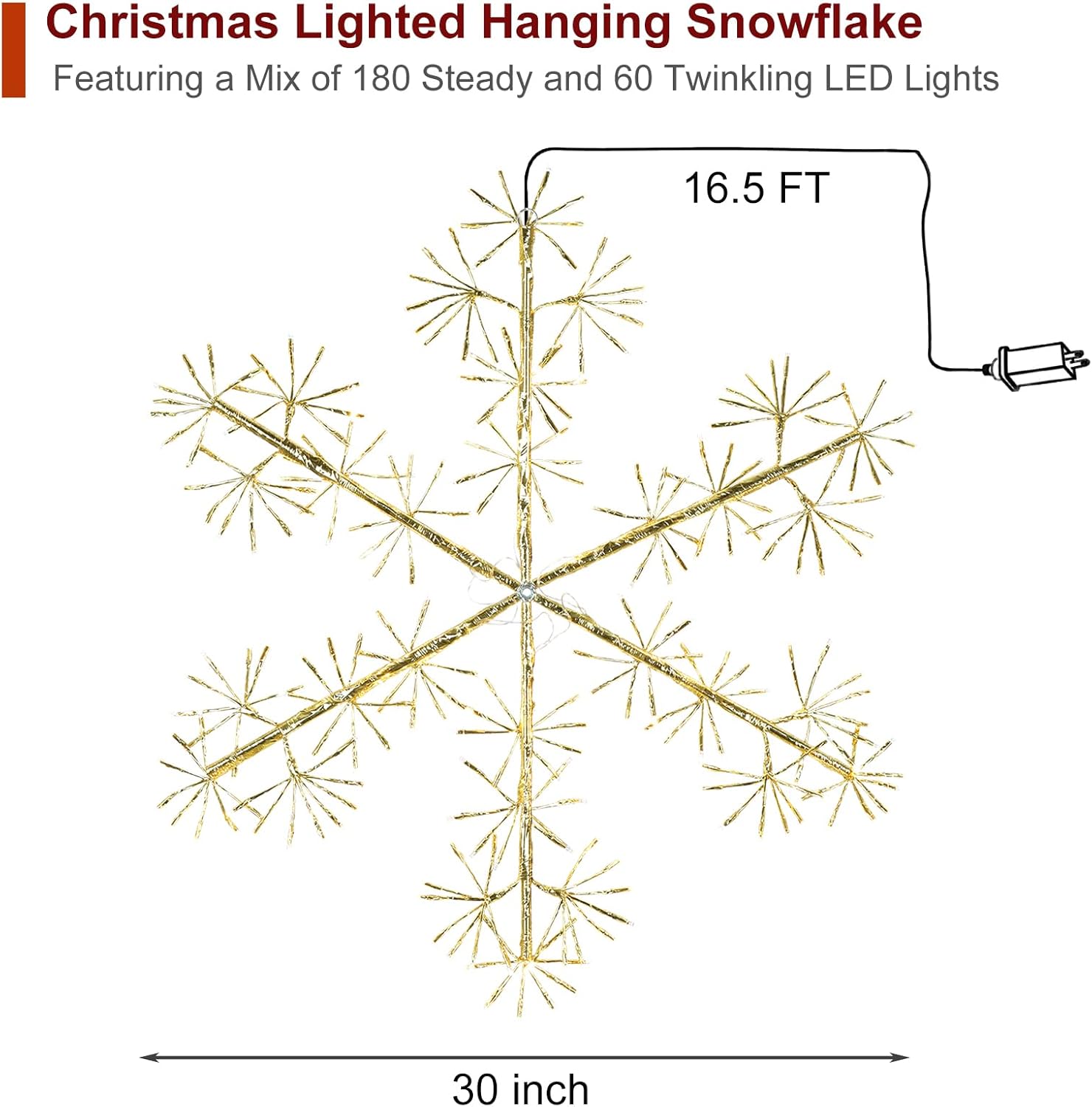 • Gorgeous Snowflake: These snowflake lights have 6 branches and comes in 3 different colors: blue, sliver and golden. Golden snowflake features 180pcs static warm white LED bulbs and 60pcs ice white twinkle bulbs (240 LED's in total) to provide a stunning nighttime display
