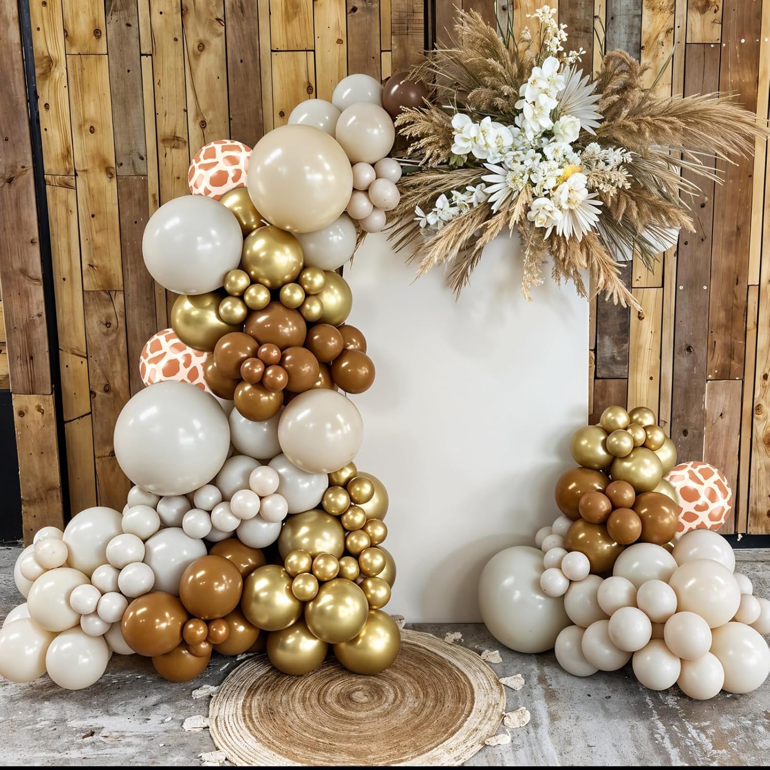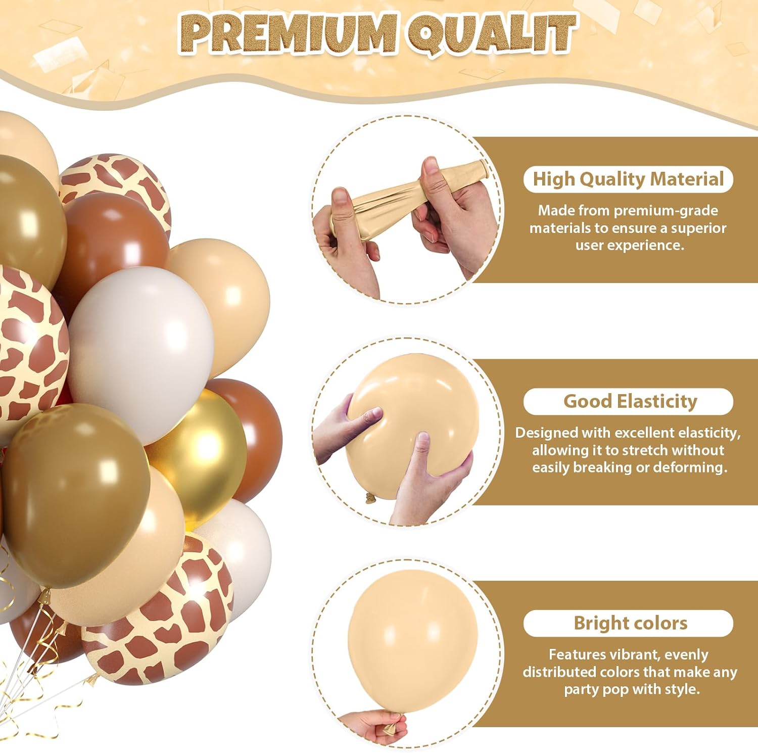 • All-in-One Set: This brown gold balloons kit includes 12pcs retro sand white balloons, 10pcs retro nude balloons, 8pcs metallic gold balloons, 12pcs coffee brown balloons, 10pcs light brown balloons, 8pcs giraffe print balloons, and 1pc gold ribbon. Whether it’s a birthday bash, wedding, or bridal shower, the thoughtful color combo, suitable for adding a fun, modern touch to any celebration.