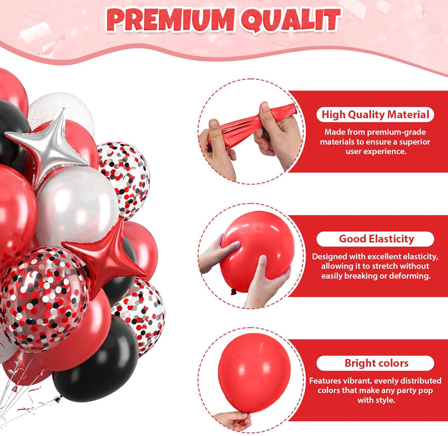• All-in-One Set: This black and red balloons kit includes 17pcs pearl red balloons, 17pcs pearl black balloons, 15pcs pearl white balloons, 8pcs red silver black confetti balloons, 3pcs 4-point star foil balloons(red, silver, black), and 1pc red ribbon. Whether it’s a birthday bash, wedding, or bridal shower, the thoughtful color combo, suitable for adding a fun, modern touch to any celebration.
