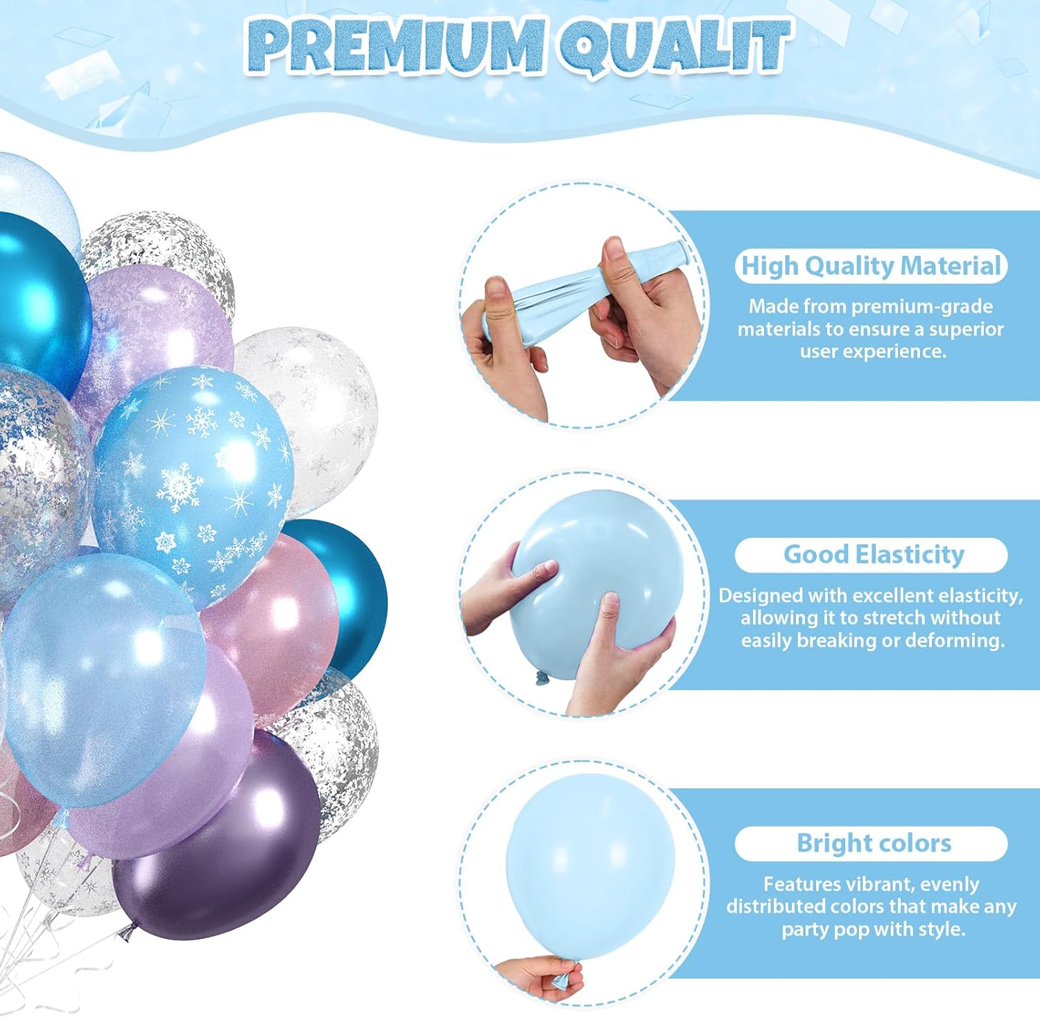 • Versatile for All Celebrations: The metallic purple blue balloons set includes clear balloons printed with white snowflakes, adding a whimsical touch that fits perfectly with winter. Pair them with metallic solids and confetti-filled balloons to bring a layered, enchanting effect to any space.
