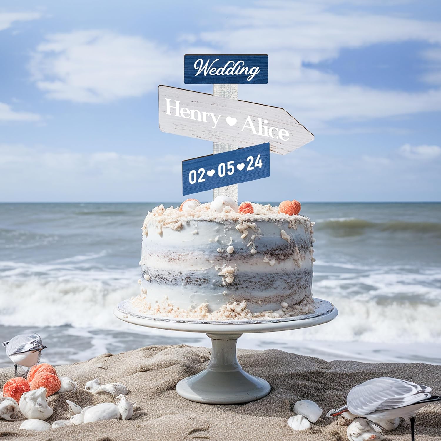 Personalized Ocean Themed Wedding Cake Topper in Wood Custom Bride & Groom Names Initials Wedding Date Cake Decoration (Navy)