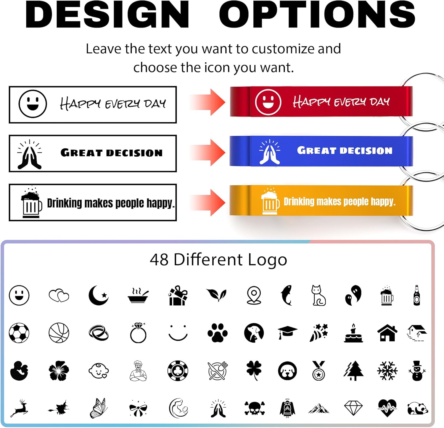 • Personalized Bottle Opener: We offer a customization service for personalized bottle openers. You can customize the text, name, date, symbol, or logo on the bottle opener keychain according to your needs.