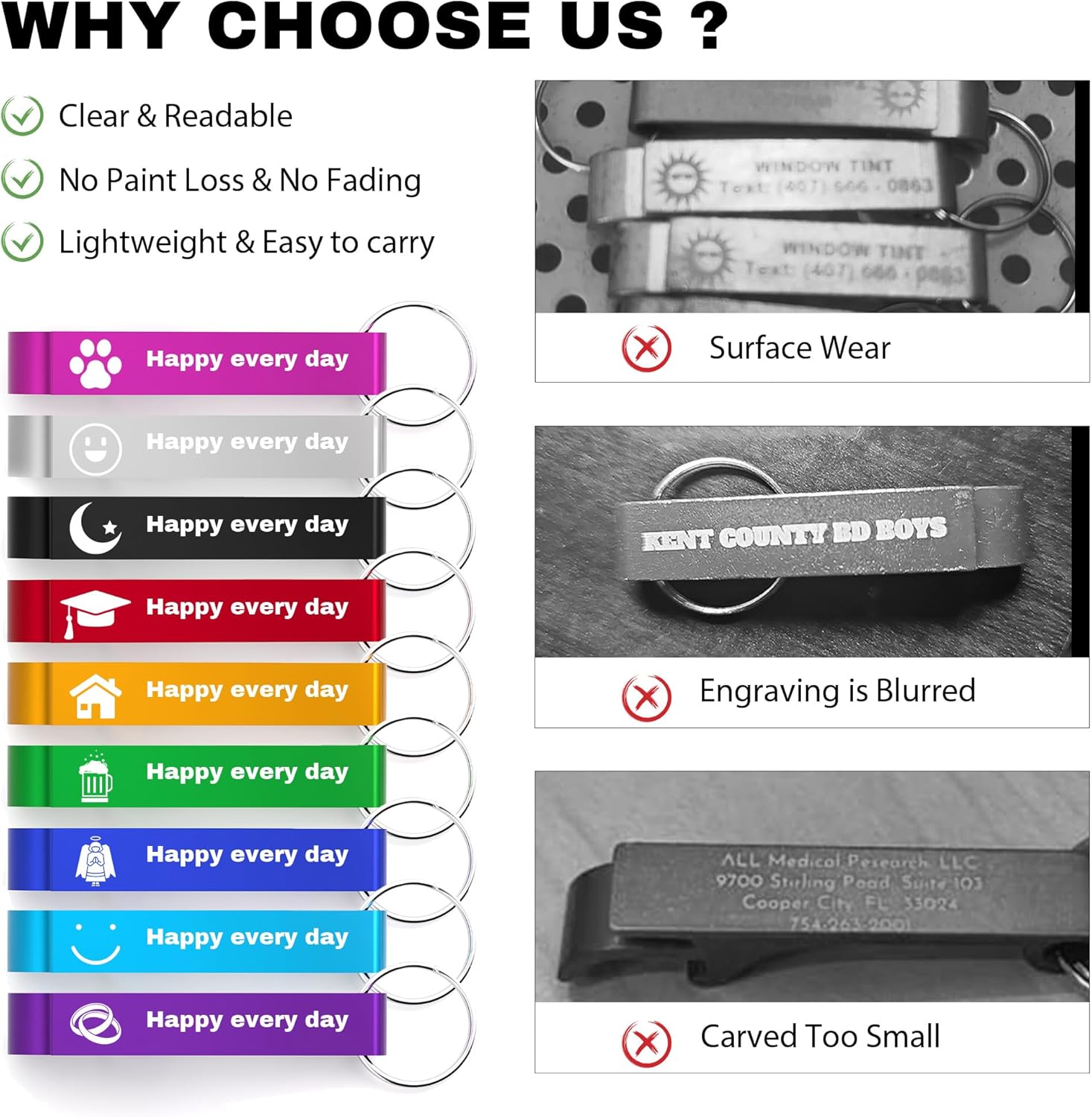 • Multiple Color Options: We have 9 bright colors for you to choose from, including red, gold, green, light blue, blue, purple, rose red, silver, and black. You can also choose from various quantities: 30 pieces, 50 pieces, and 100 pieces etc.. The personalized bottle opener with a keychain is brightly colored, stylish, and looks very cute.