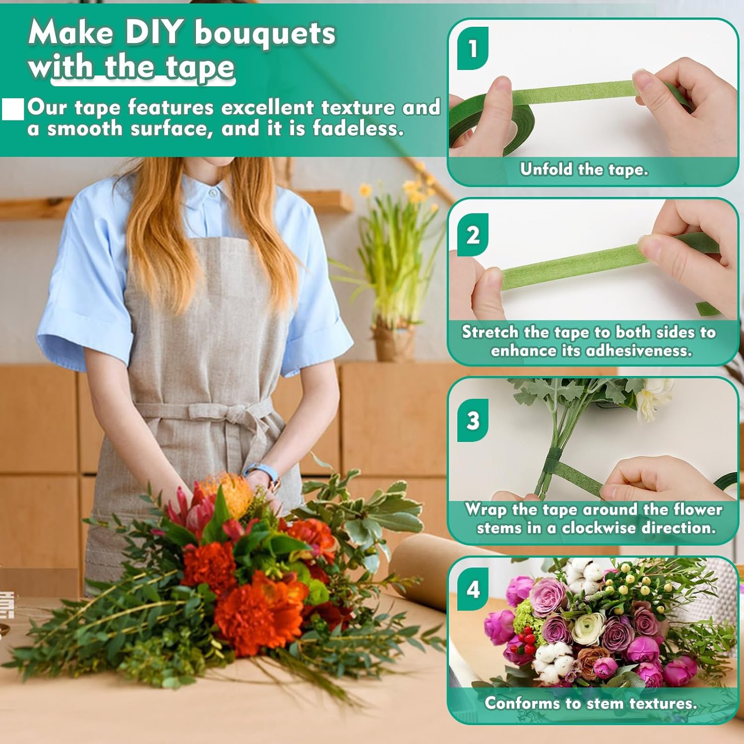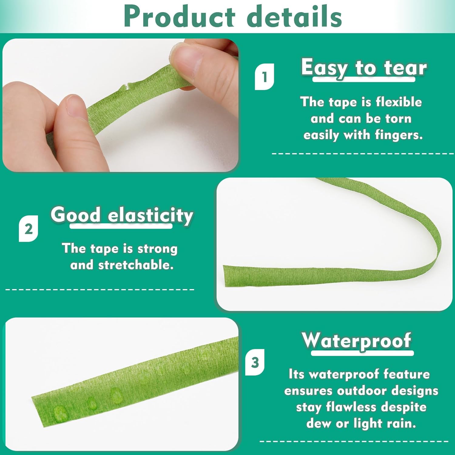 • Waterproof and Does Not Fade: Our green floral tapes still remain sturdy and long-lasting around the flower stems even if they are wrapped around the flower stems in the water. The tape is waterproof, providing maximum viscosity for a wet surface, and will not fade even when immersed in water