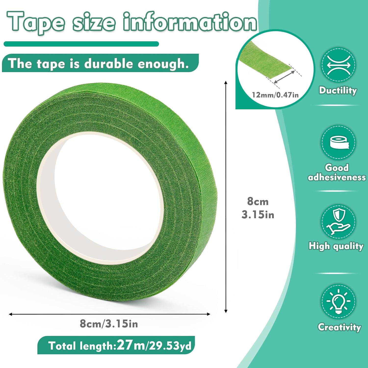• Floral Tape for Bouquets: Dimensions: each roll is 0.47 inch (1.2)CM in width and 30 yards(27M) in length. Strong and Stretchable, it tears easily, lightweight, and flexible to use