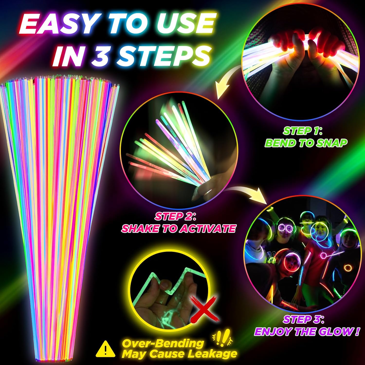 • 【BRIGHT & LONG-LASTING GLOW STICKS】: Designed to shine for over 9 hours, our 100Pcs 22 inch glow sticks deliver bold, vivid colors in 8 dazzling shades: red, orange, yellow, green, blue, purple, white, and pink. Just bend, snap, and shake—then let the glowing fun begin! DO NOT over-bend or fold repeatedly, as this may cause leakage.