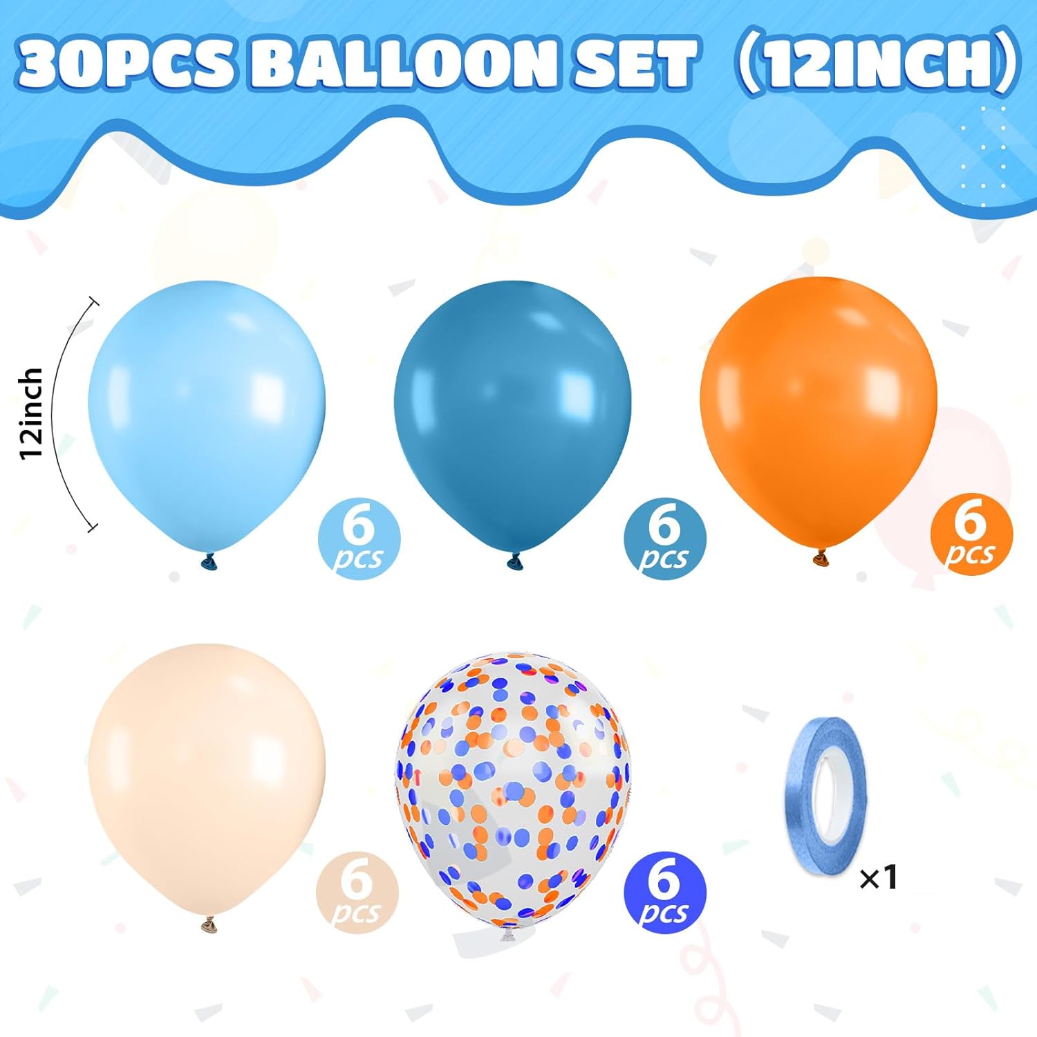 • 【12 Inch Orange and Blue Balloons Set】Orange balloons (6 pcs),retro blue balloons (6 pcs),light blue balloons (6 pcs),apricot balloons (6pcs),orange and blue confetti balloons 6 pcs),blue balloon ribbon (1 roll), 30pcs in our dusty blue balloons set. Suitable for decorating various occasions, such as boys blue theme party birthday baby shower anniversary graduation wedding.
