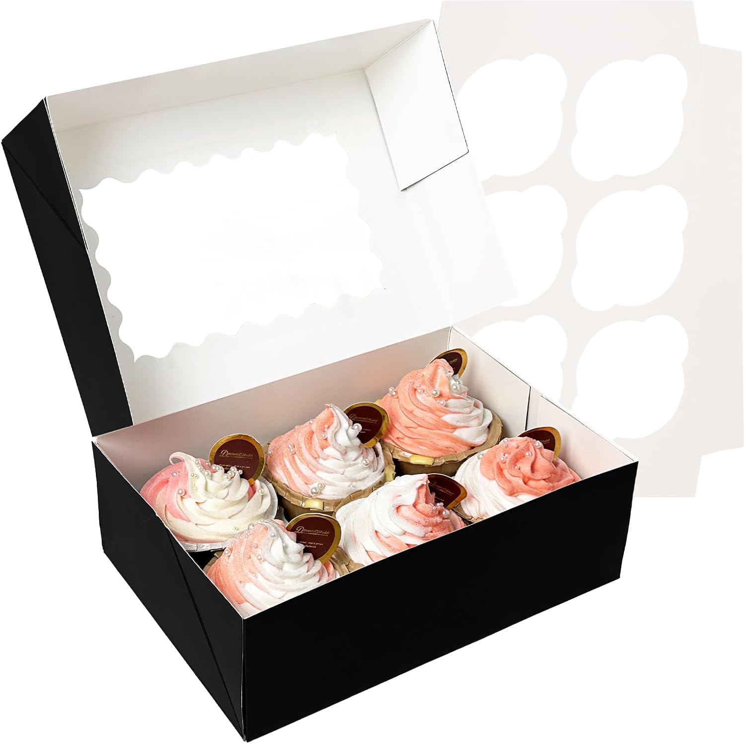 Bakepacker Auto-pop up 6 Cupcake Boxes with Window 20 Count Black Box 9.4 x 6.1 x 3 inch Cupcake Carrier