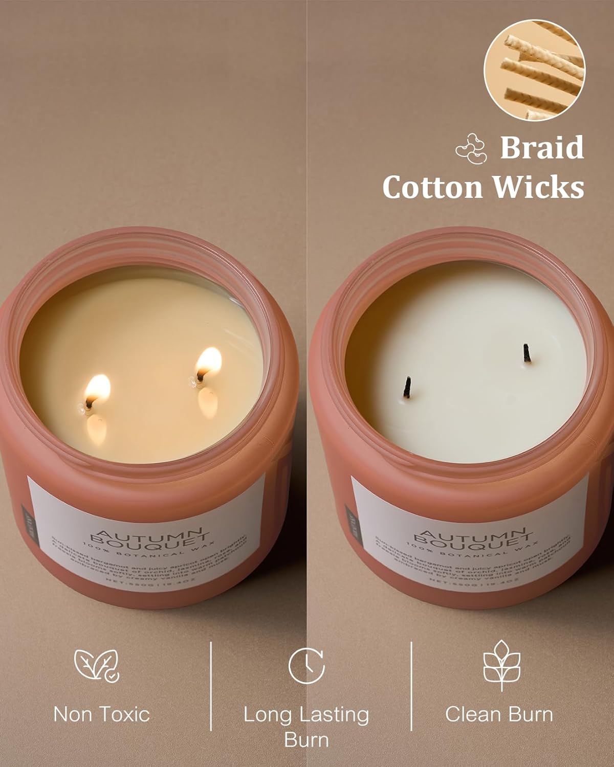 • Clean Consistent & Even Burn - Using 2 American made lead-free cotton wicks for a even burn result. They're cotton flat braid wicks with paper throughout, providing increased rigidity and burn more consistently than 100% cotton wicks. Designed to reduce carbon buildup which leads to black soot