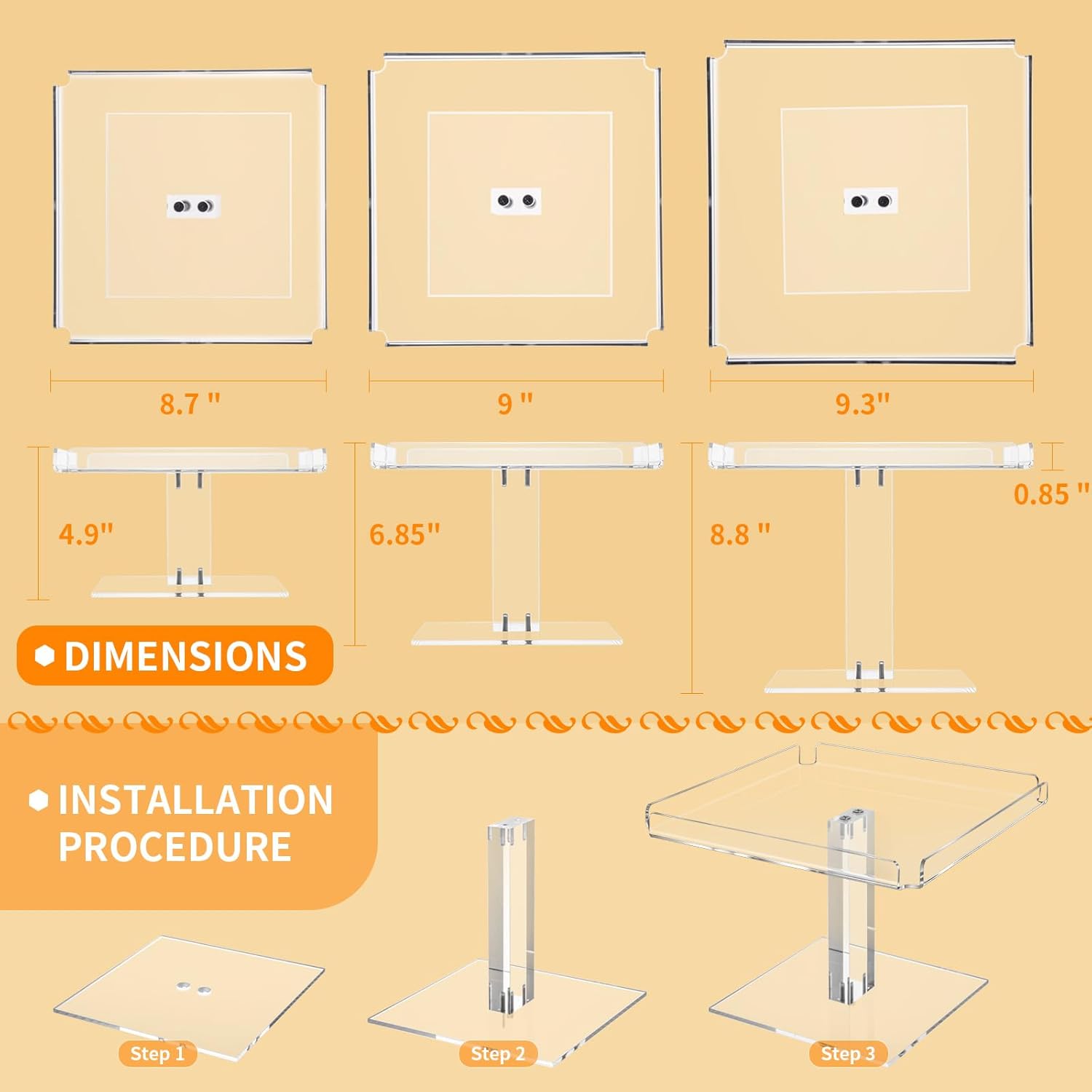• 【Widely Used】 Acrylic display stands can be used in many ways. You can use them to display cupcakes, pies, fruit, pastries, cookies, chocolates, jewellery, cosmetics, figures and much more. They are perfect for weddings, birthday parties, Christmas, Thanksgiving and other holiday gatherings