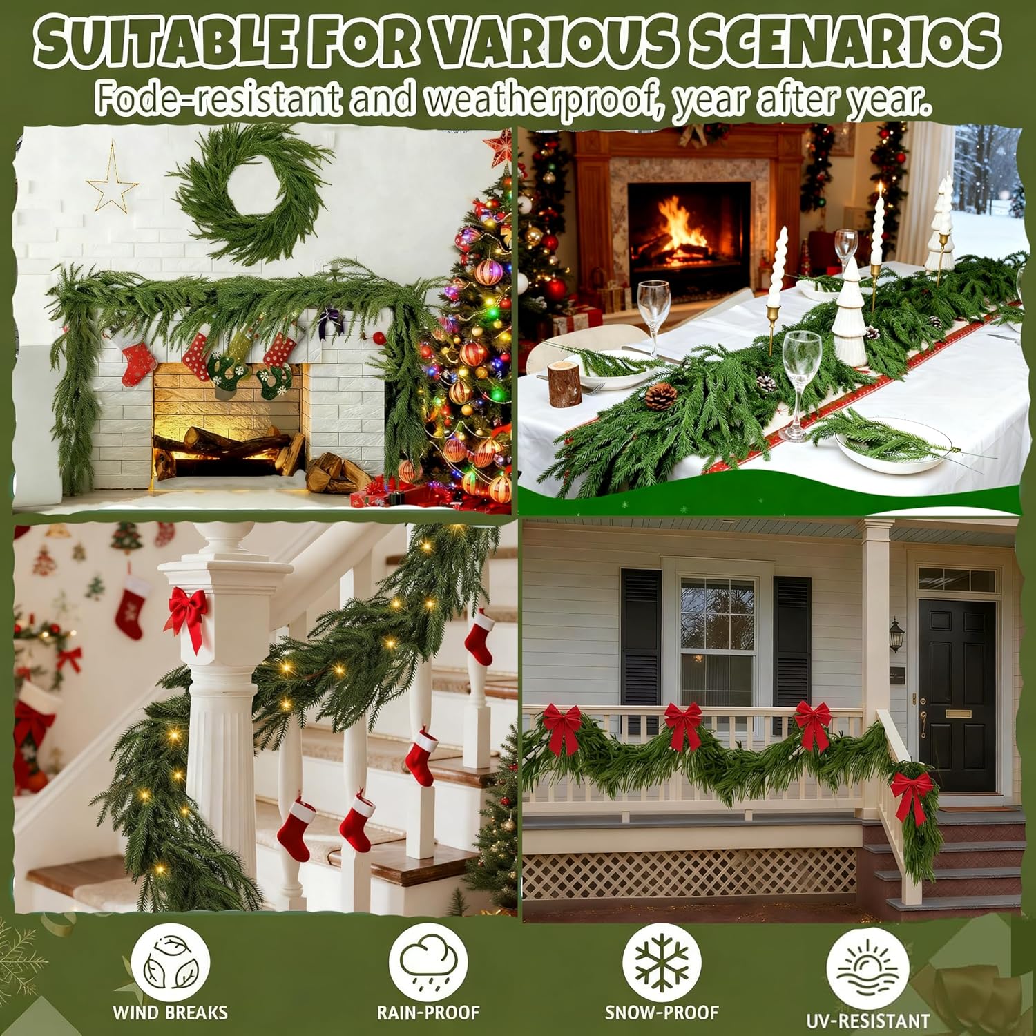 • Continue Reusing: Fake pine garland boasts a lifelike appearance; however, unlike real plants, it does not fade or rot, ensuring it always looks fresh and vibrant.xmas garland is both water-resistant and fade-resistant,after the season, you can easily store it in the provided packaging to reuse it next year