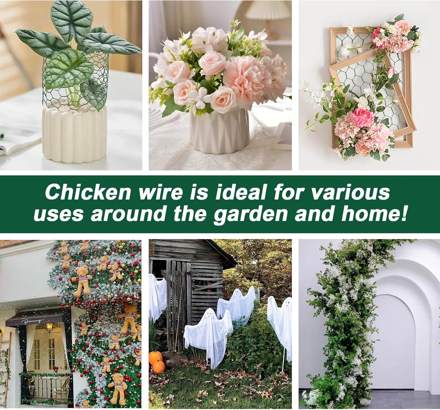 • 【Garden Protection & Home Decoration】Chicken Wire Mesh is widely used in our garden and house. In house decoration, it's ideal for creating photo walls, flower arrangement frames; in the garden, it's also perfect for making protective netting cover to protect small potted plants, plant climbing netting to provide strong support for climbing plants, and building Halloween decorative props.