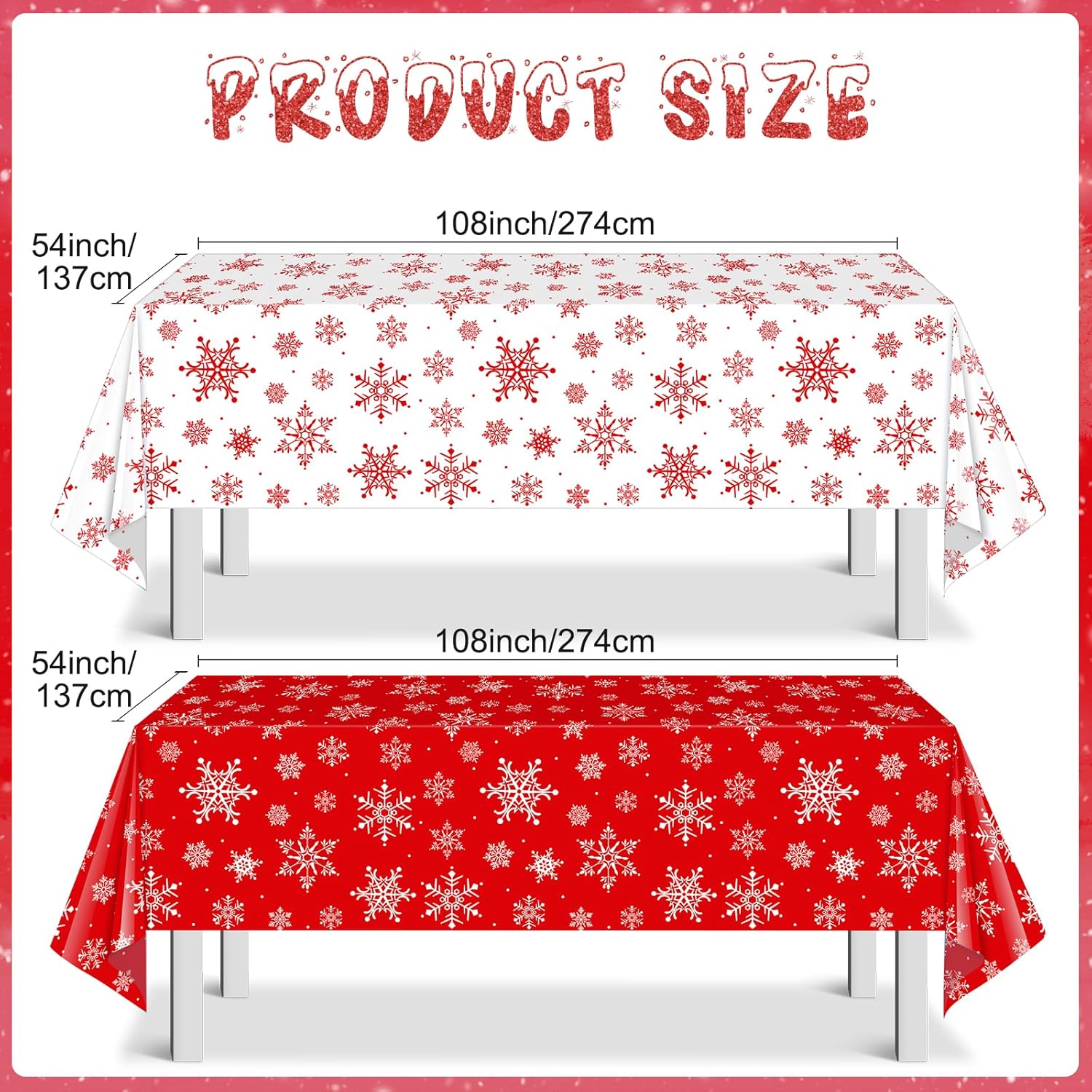 • What will you receive: 6 pieces red Christmas party tablecloth and 6 piece white Christmas plastic tablecloth,all over printed with snowflake patterns,ideal for decorating your winter holiday and Christmas party supplies and decorations