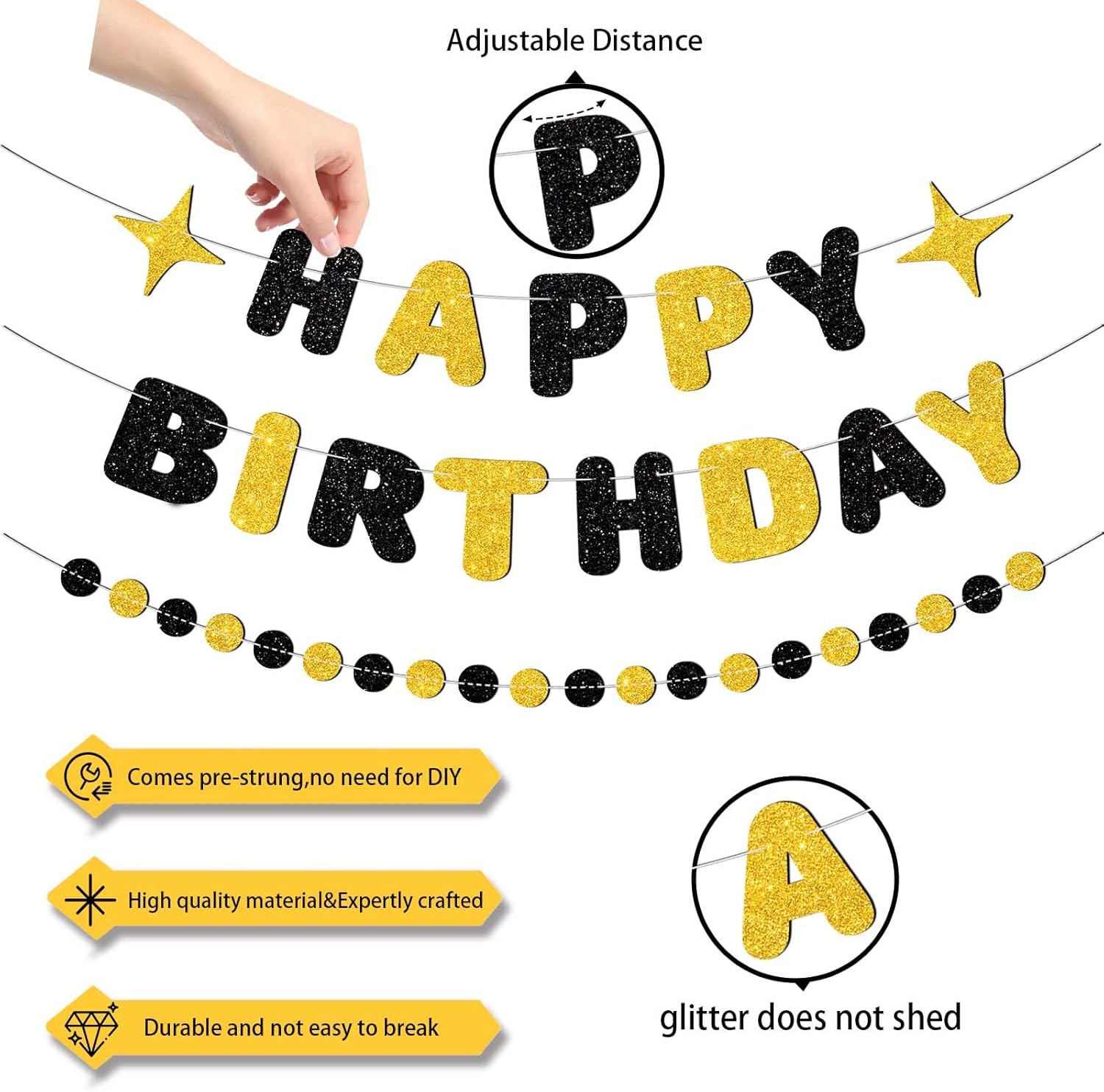 • PRE-STRUNG | NO DIY: Our happy birthday banner black and gold will arrive to you with each letter already pre-strung on a 10 ft strand,you don't have to fuss over assembly.It is easy to hang the backdrop banner.The birthday banner is large enough for birthday party decorations,black and gold birthday decorations and any other birthday decor.