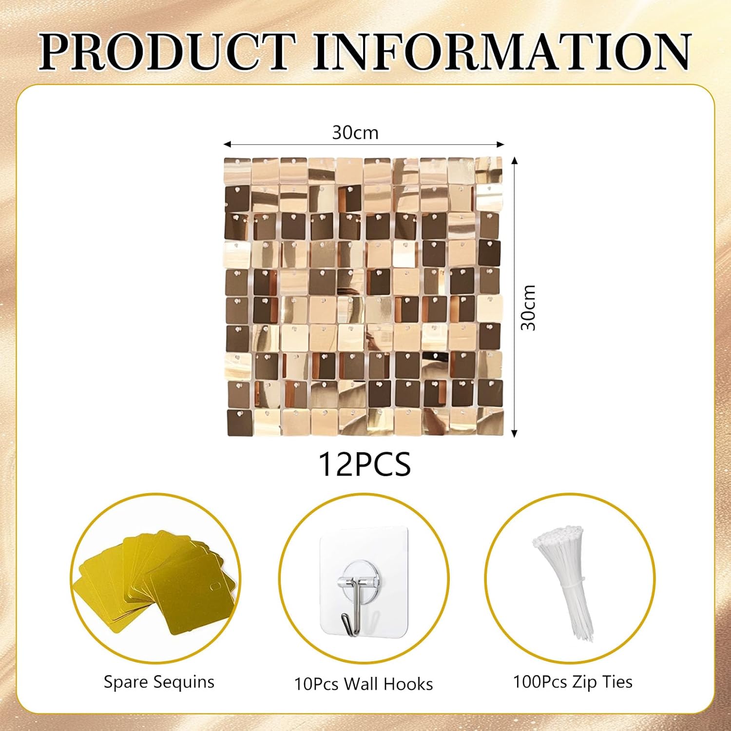 12PCS Champagne Shimmer Wall Backdrop, Square Sequin Photo Backdrops Panel, Glitter Wall Background for Birthdays, Weddings, Christmas, Engagements, Disco Bachelorette Party Decoration (3FTx4FT)