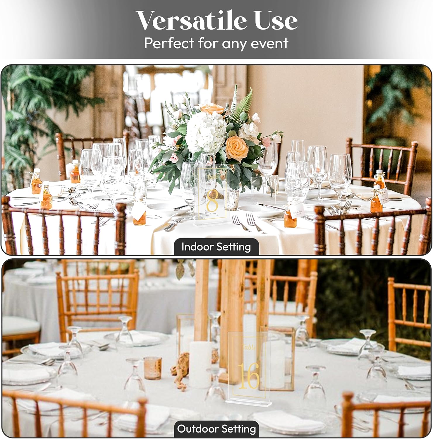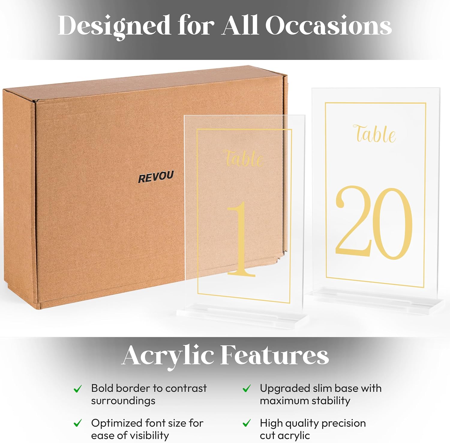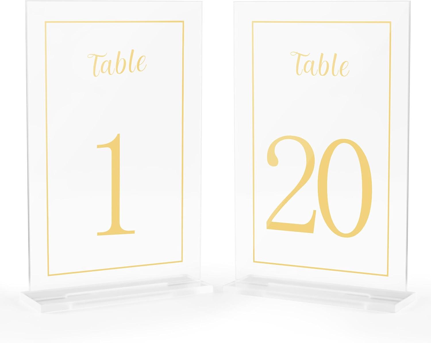 • [PACKAGE INCLUDES] Our acrylic table number package includes a pack of 20 stands with printed table numbers signs from 1 to 20. A perfect addition to your event and organization essentials with a timeless centerpiece decoration.