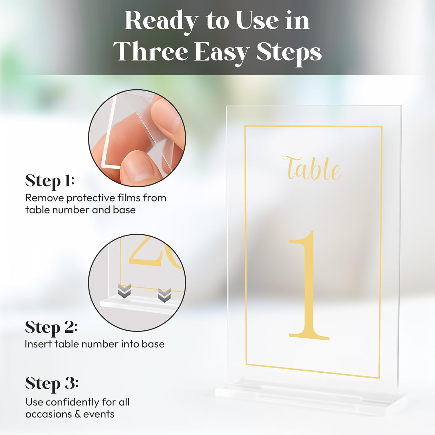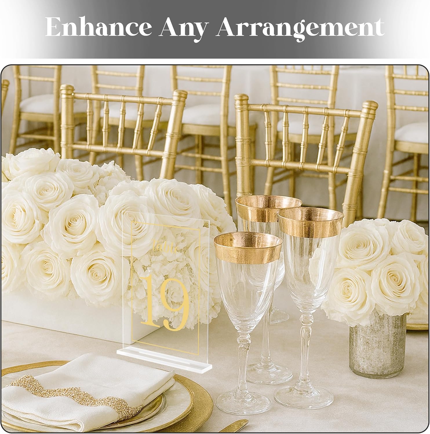 • [PREMIUM MATERIAL] These exquisite table numbers are beautifully designed in stunning shape with printed calligraphy and premium quality clear acrylic material. The slim and stable base offer superior stability. The table numbers and bases are covered with protective film to prevent scratching.