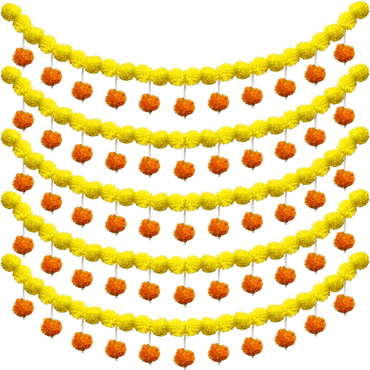 5 Pcs Marigold Garland Diwali Decor Artificial Flowers, 4.5 Feet Artificial Marigold Flowers for Indian Pooja Diwali Home Mantle Decor Wedding Decoration for All Year Decoration (Yellow&Orange)