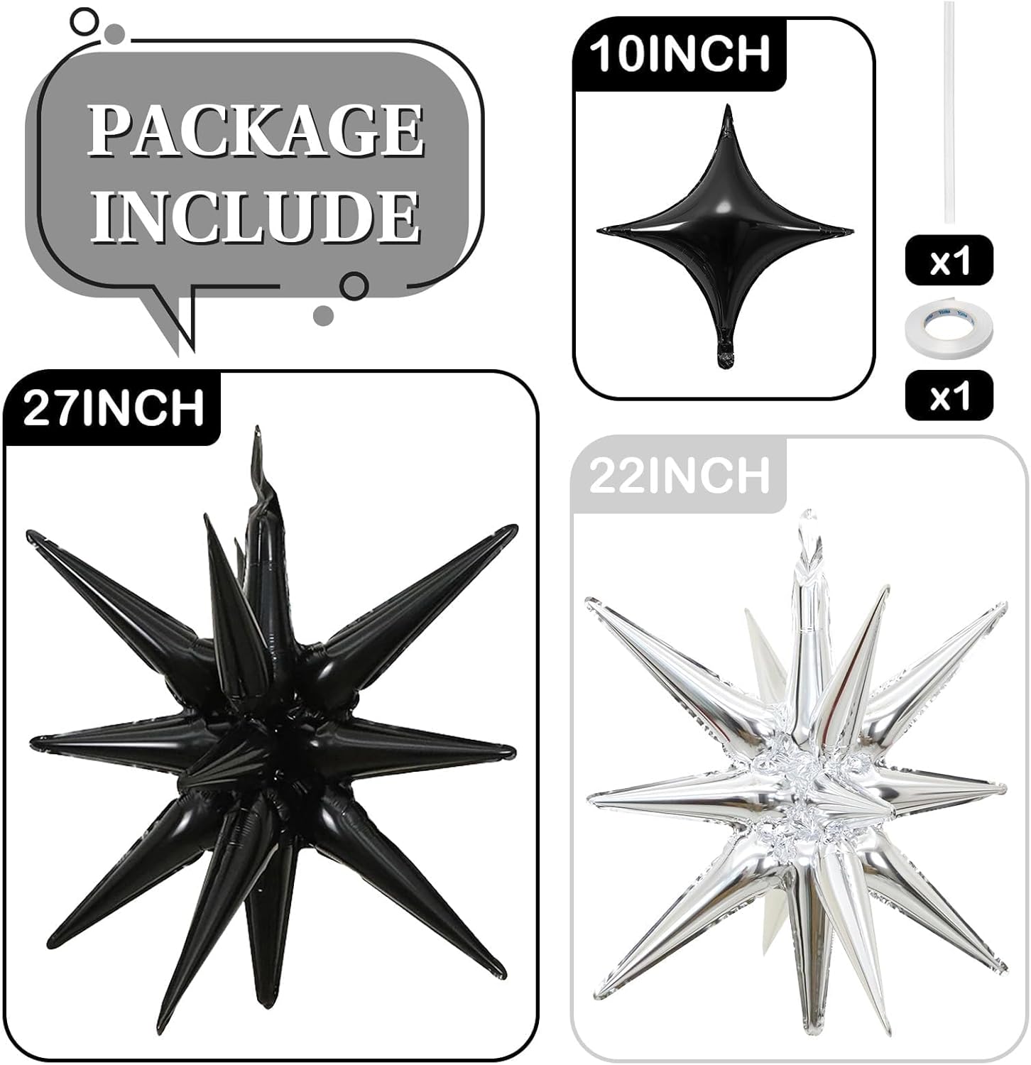 • One-piece Star Balloons: Includes 12pcs One-piece star burst balloons in bold colors: 3pcs × 27in , 3pcs × 22in explosion star balloons and 6pcs × 10in four angle star balloons. Arrives ready to use with 1 straw and 1 roll of ribbon—just inflate and decorate.