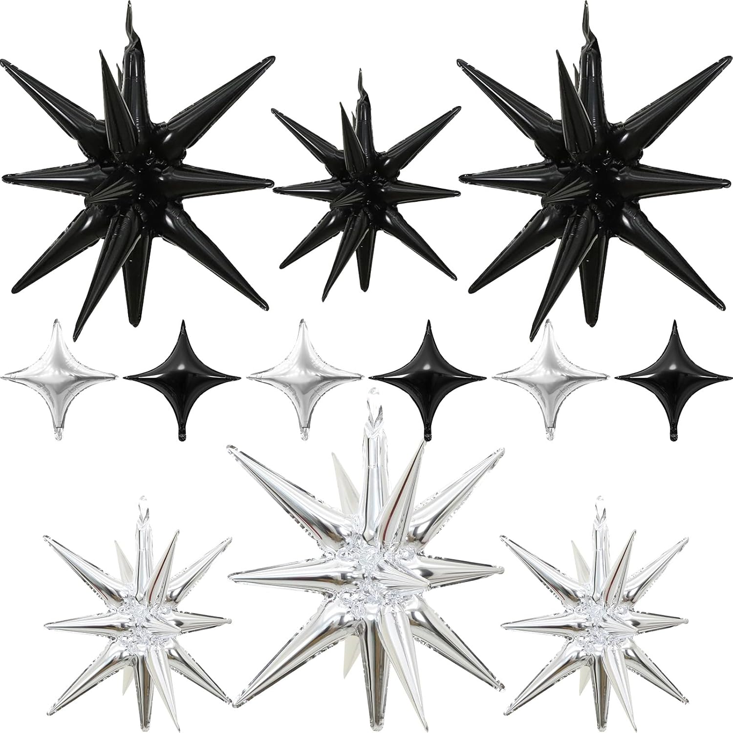 Black Silver Star Balloons 12pcs, 27/22 Inch Foil Star Explosion Balloons, Large Spike Mylar Cone Balloon, Fireworks Shape Balloon Decor for Bachelor Retirement Anniversary Graduation