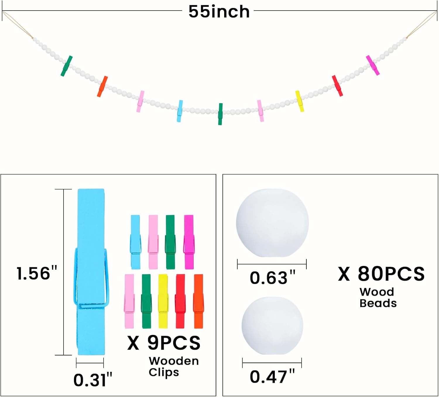 • High-Quality Material: Photo garland is handmade by white wooden beads and jute rope, which is durable, corrosion-resistant and non-toxic, not easy to break and fade, can be applied for a long time. Note: The colours of the wooden clips are random